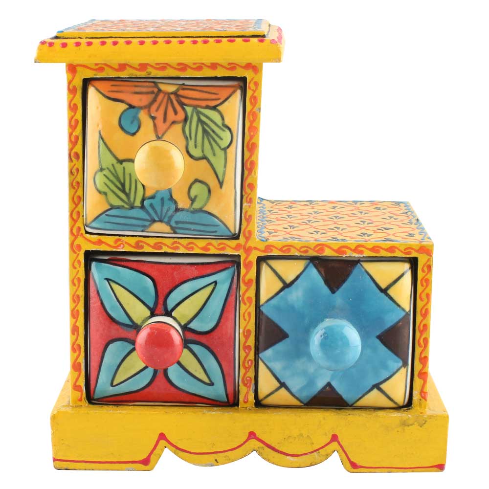 Spice Box-981 Masala Rack Container Gift Item. Ceramic Drawers in Wooden Frame. The Spice Boxes are designed with different patterns. These boxes are made using natural wood which does not harm the purity of spices.