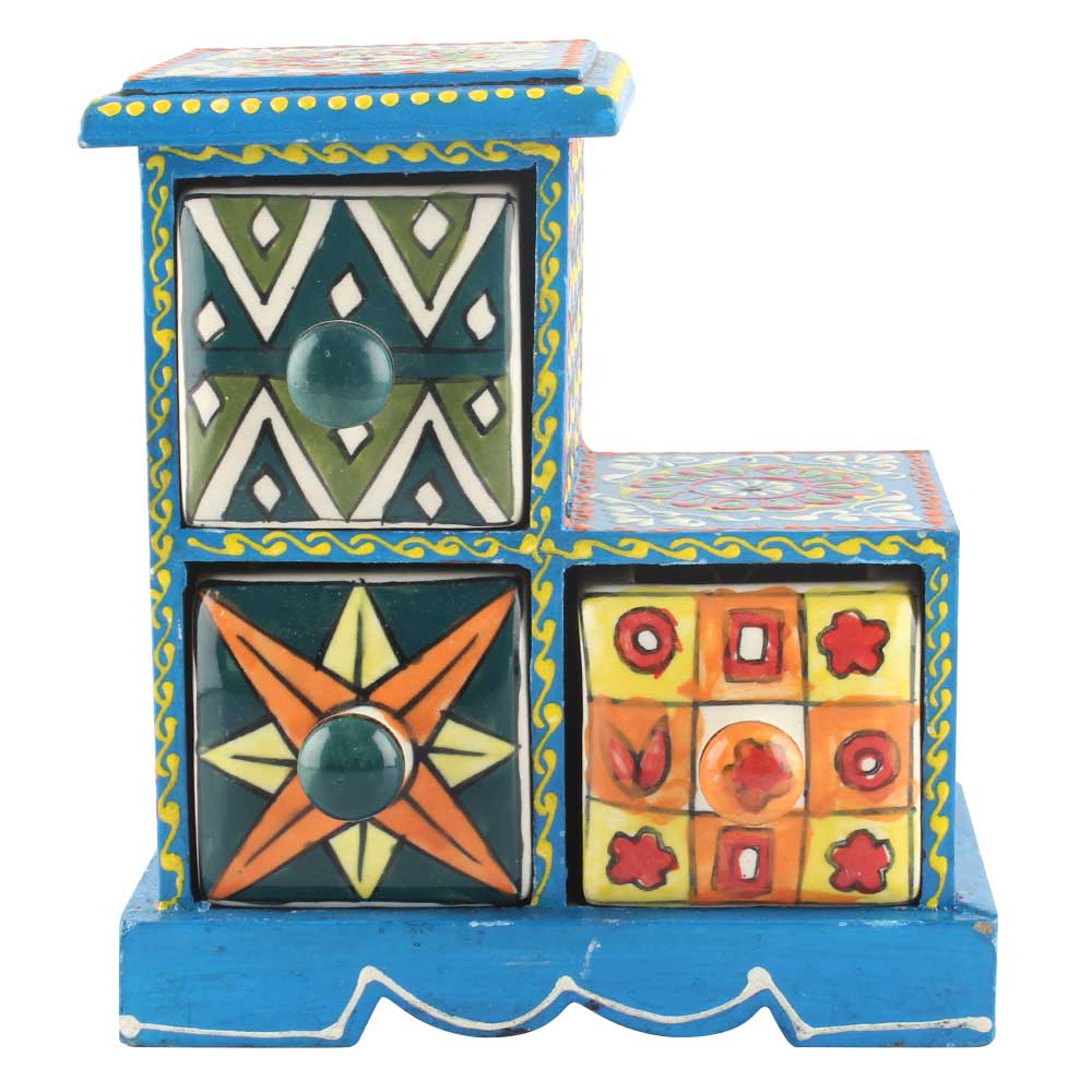 Spice Box-1001 Masala Rack Container Gift Item. Ceramic Drawers in Wooden Frame. The Spice Boxes are designed with different patterns. These boxes are made using natural wood which does not harm the purity of spices.