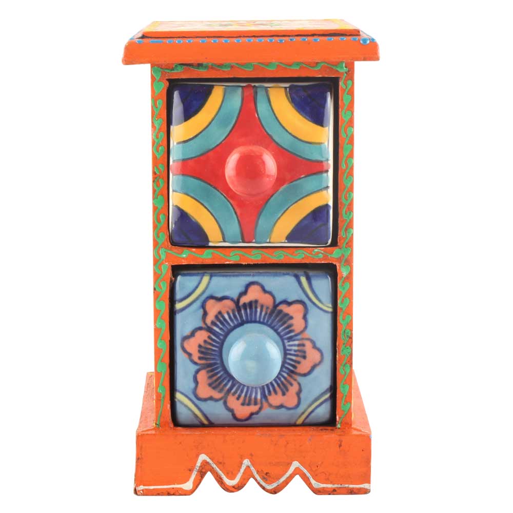 Spice Box-1015 Masala Rack Container Gift Item. Ceramic Drawers in Wooden Frame. The Spice Boxes are designed with different patterns. These boxes are made using natural wood which does not harm the purity of spices.