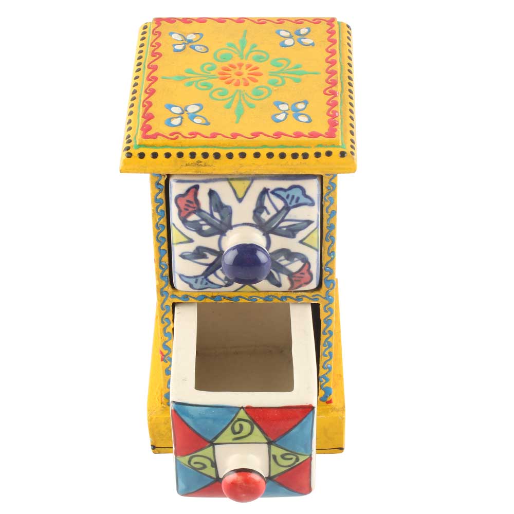 Spice Box-1018 Masala Rack Container Gift Item. Ceramic Drawers in Wooden Frame. The Spice Boxes are designed with different patterns. These boxes are made using natural wood which does not harm the purity of spices.
