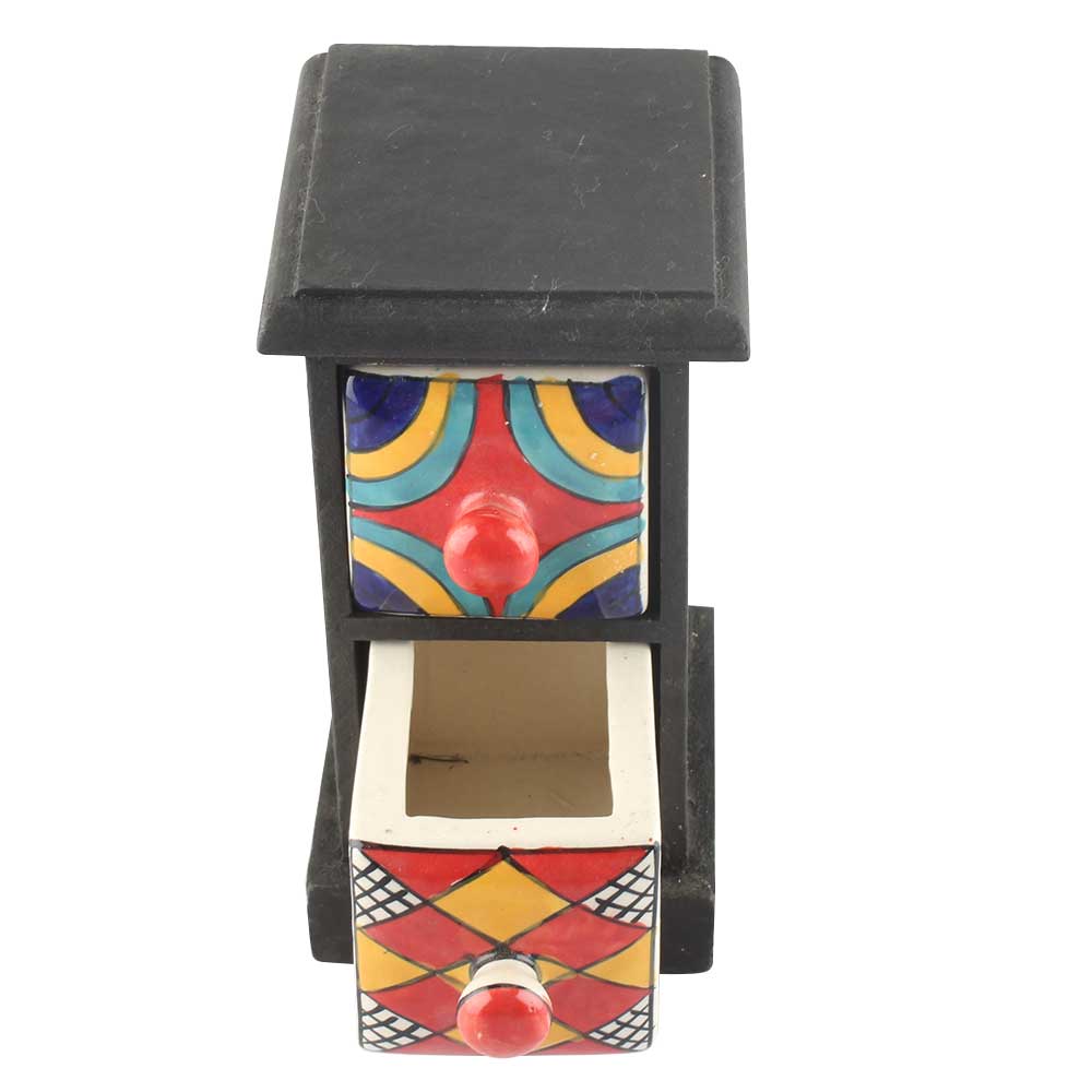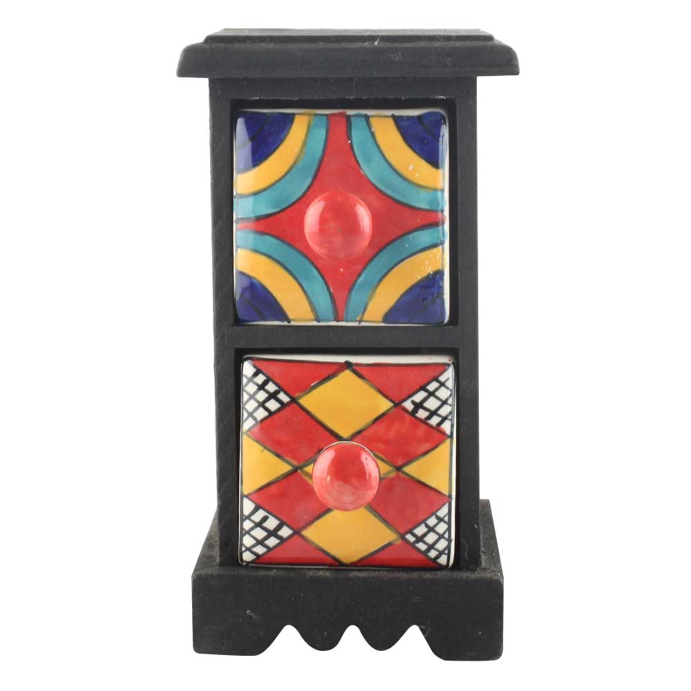 Spice Box-1060 Masala Rack Container Gift Item. Ceramic Drawers in Wooden Frame. The Spice Boxes are designed with different patterns. These boxes are made using natural wood which does not harm the purity of spices.