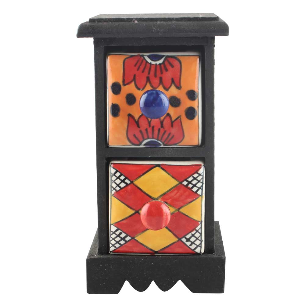 Spice Box-1066 Masala Rack Container Gift Item. Ceramic Drawers in Wooden Frame. The Spice Boxes are designed with different patterns. These boxes are made using natural wood which does not harm the purity of spices.