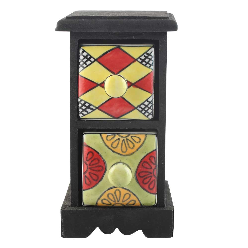 Spice Box-1088 Masala Rack Container Gift Item. Ceramic Drawers in Wooden Frame. The Spice Boxes are designed with different patterns. These boxes are made using natural wood which does not harm the purity of spices.