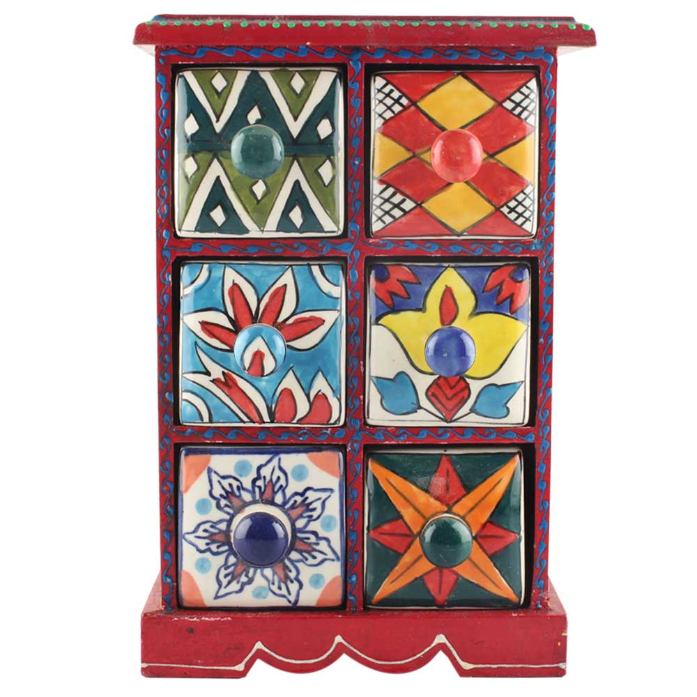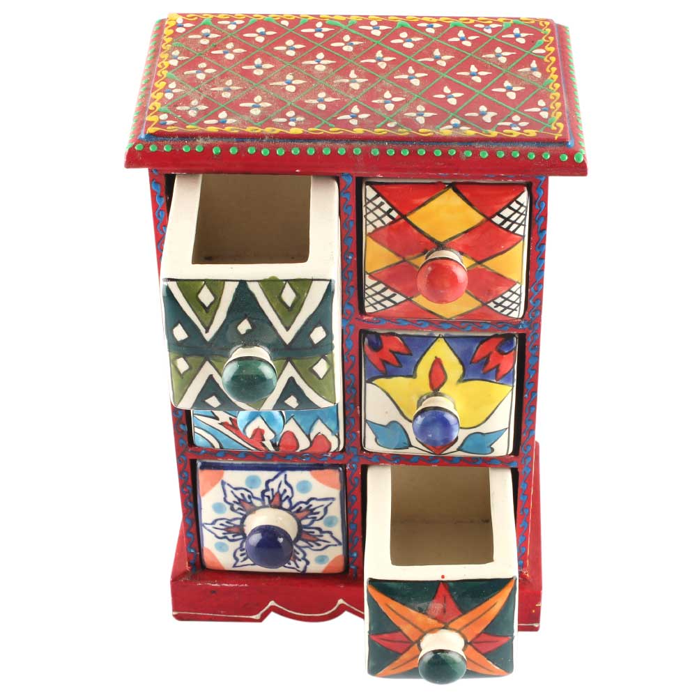 Spice Box-1100 Masala Rack Container Gift Item. Ceramic Drawers in Wooden Frame. The Spice Boxes are designed with different patterns. These boxes are made using natural wood which does not harm the purity of spices.
