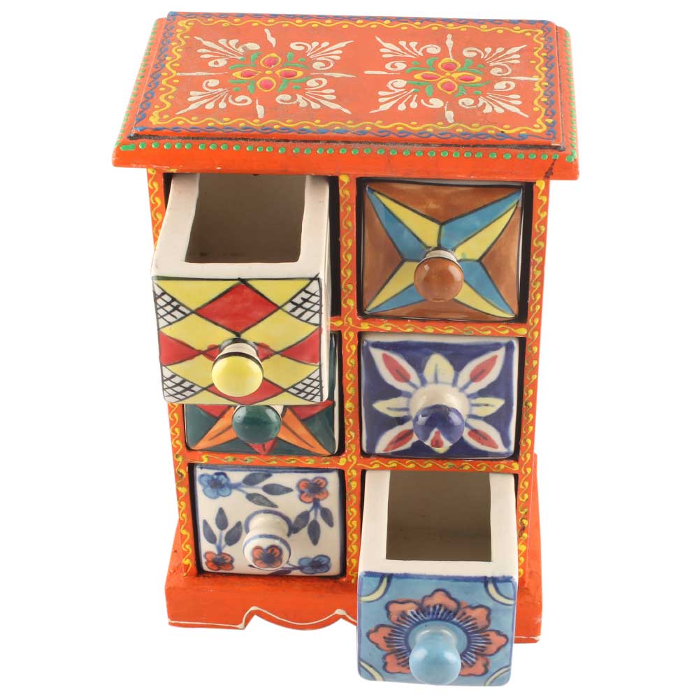 Spice Box-1114 Masala Rack Container Gift Item. Ceramic Drawers in Wooden Frame. The Spice Boxes are designed with different patterns. These boxes are made using natural wood which does not harm the purity of spices.