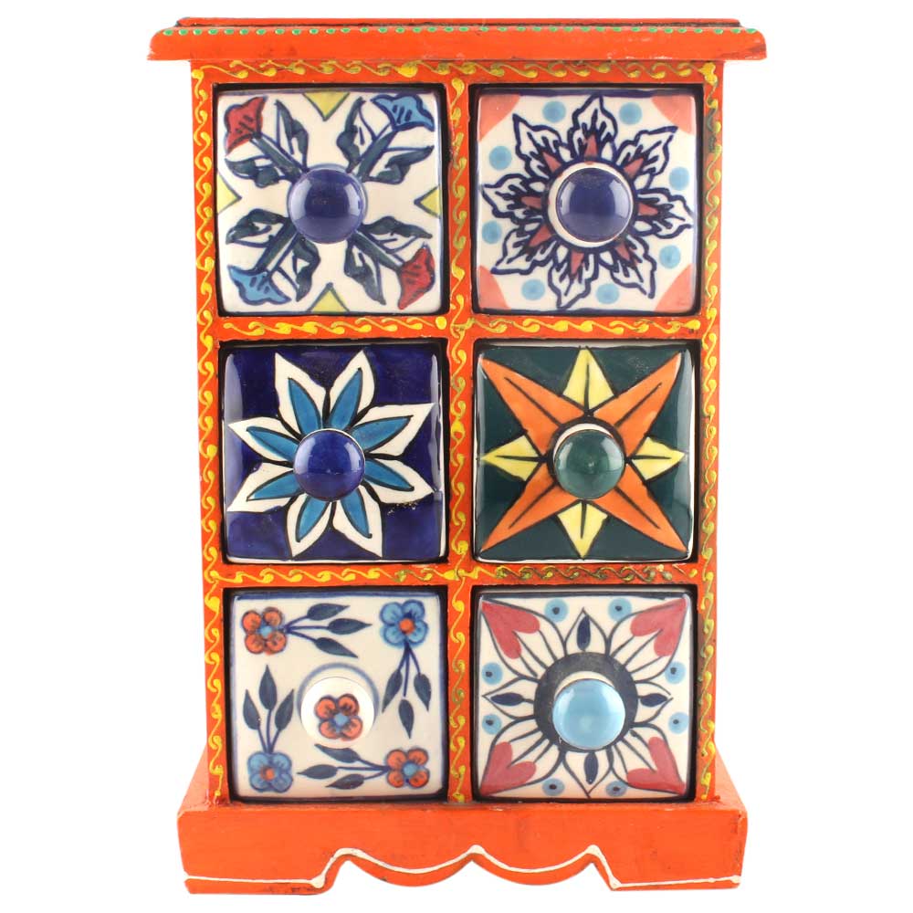 Spice Box-1116 Masala Rack Container Gift Item. Ceramic Drawers in Wooden Frame. The Spice Boxes are designed with different patterns. These boxes are made using natural wood which does not harm the purity of spices.