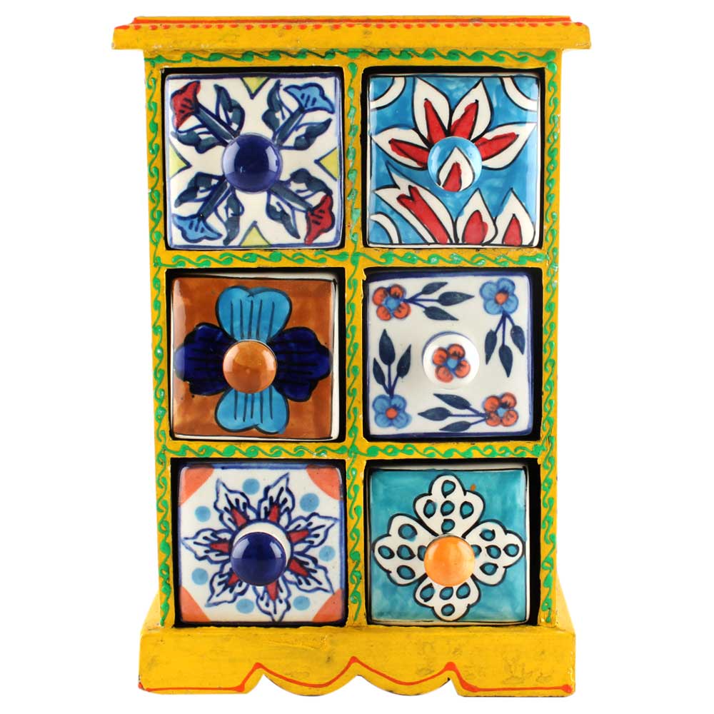 Spice Box-1118 Masala Rack Container Gift Item. Ceramic Drawers in Wooden Frame. The Spice Boxes are designed with different patterns. These boxes are made using natural wood which does not harm the purity of spices.