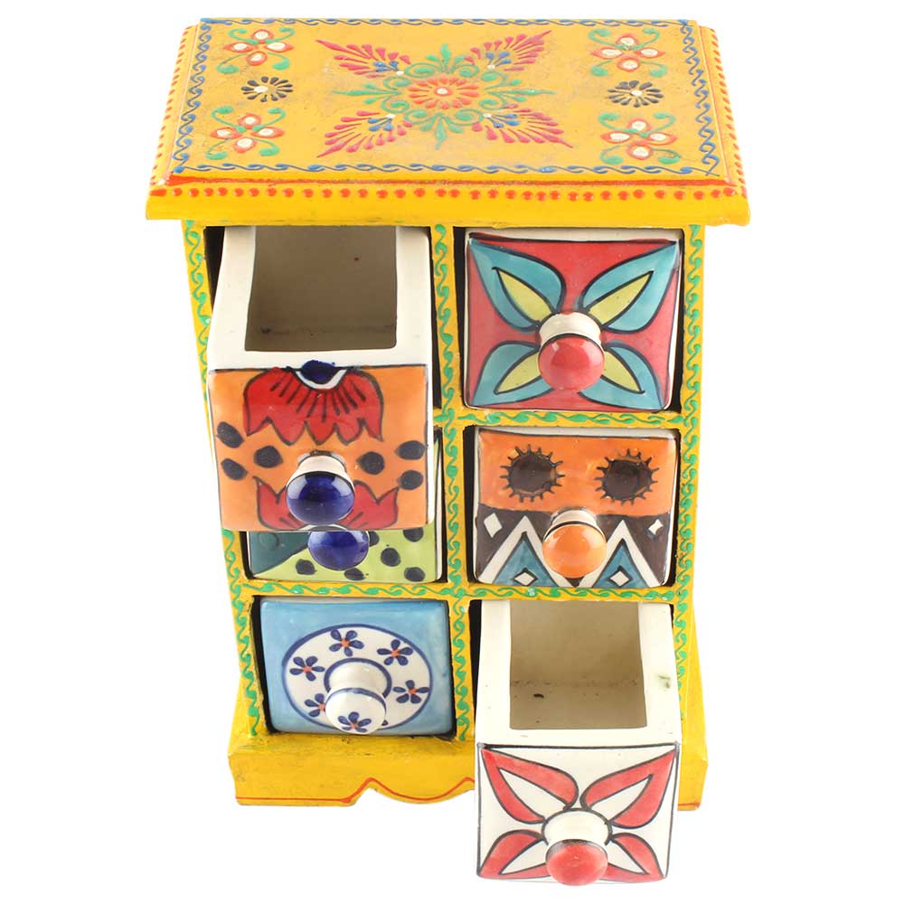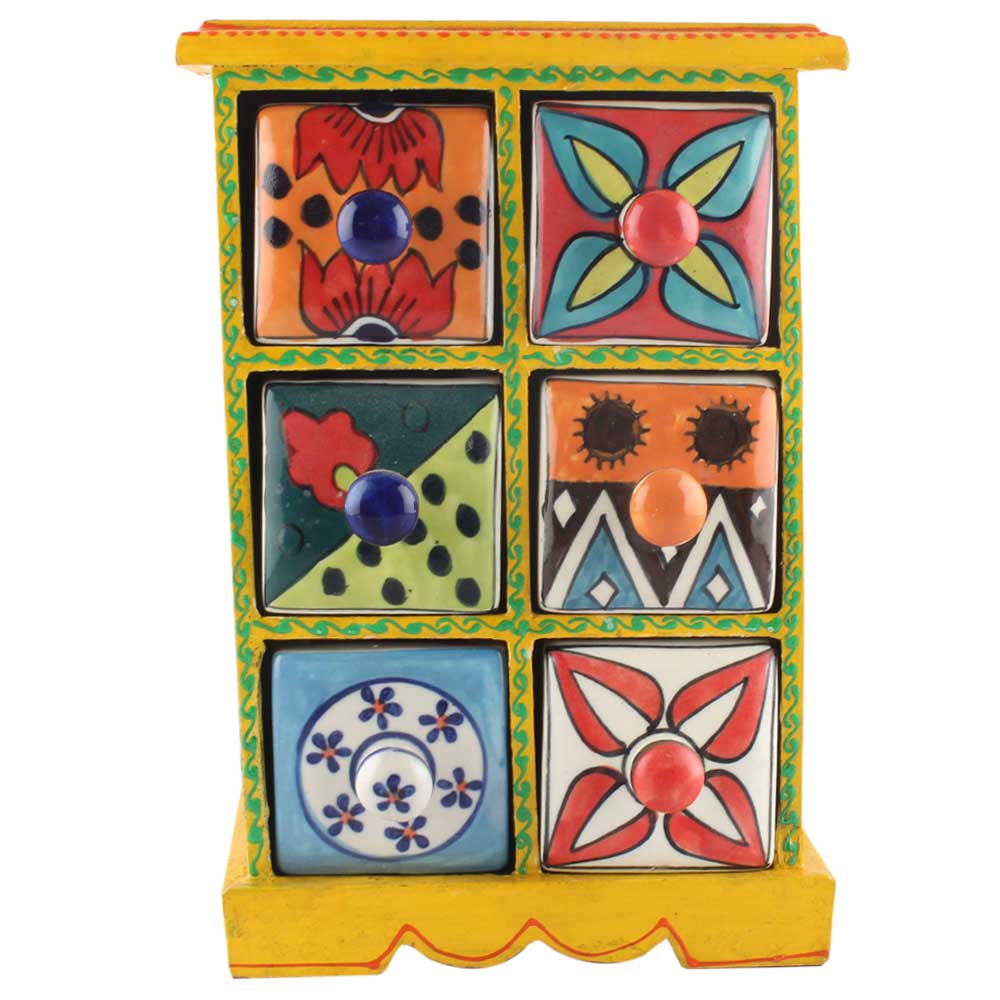 Spice Box-1123 Masala Rack Container Gift Item. Ceramic Drawers in Wooden Frame. The Spice Boxes are designed with different patterns. These boxes are made using natural wood which does not harm the purity of spices.
