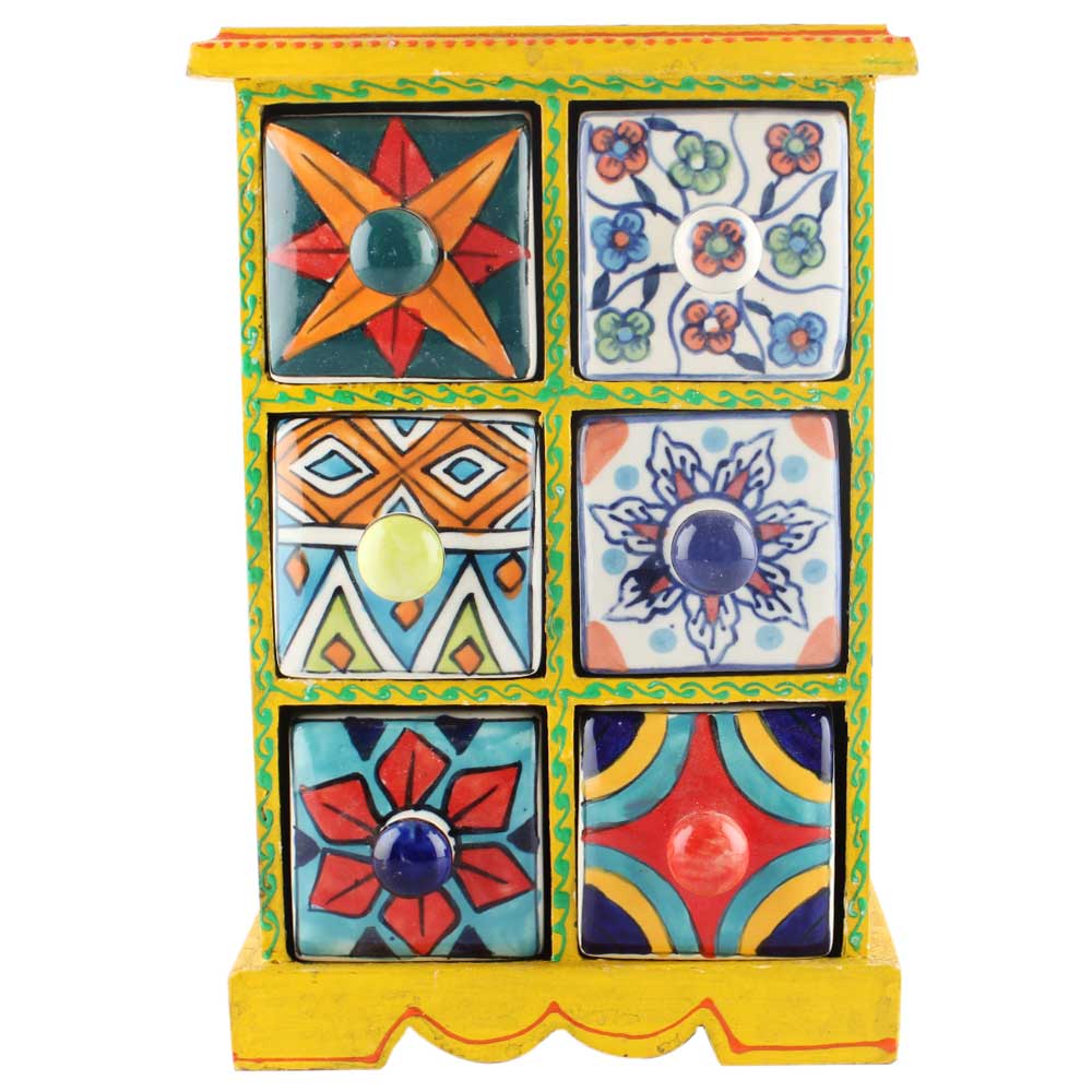 Spice Box-1124 Masala Rack Container Gift Item. Ceramic Drawers in Wooden Frame. The Spice Boxes are designed with different patterns. These boxes are made using natural wood which does not harm the purity of spices.