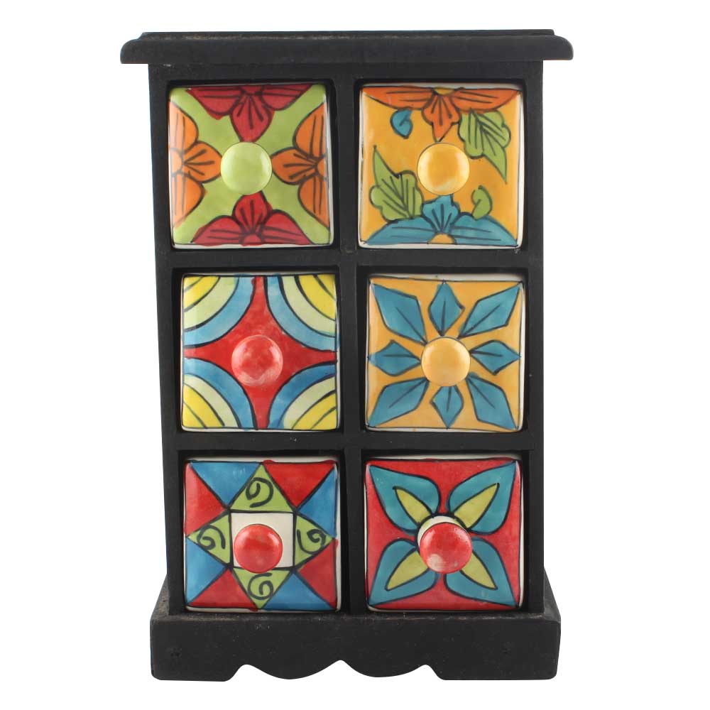 Spice Box-1167 Masala Rack Container Gift Item. Ceramic Drawers in Wooden Frame. The Spice Boxes are designed with different patterns. These boxes are made using natural wood which does not harm the purity of spices.