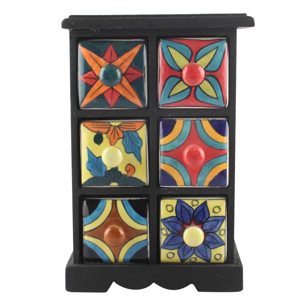 Spice Box-1173 Masala Rack Container Gift Item. Ceramic Drawers in Wooden Frame. The Spice Boxes are designed with different patterns. These boxes are made using natural wood which does not harm the purity of spices.