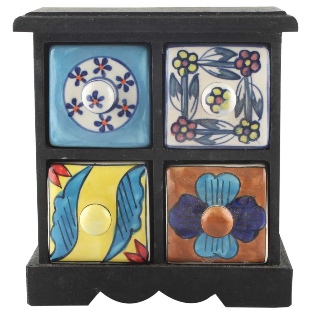 Spice Box-1203 Masala Rack Container Gift Item. Ceramic Drawers in Wooden Frame. The Spice Boxes are designed with different patterns. These boxes are made using natural wood which does not harm the purity of spices.