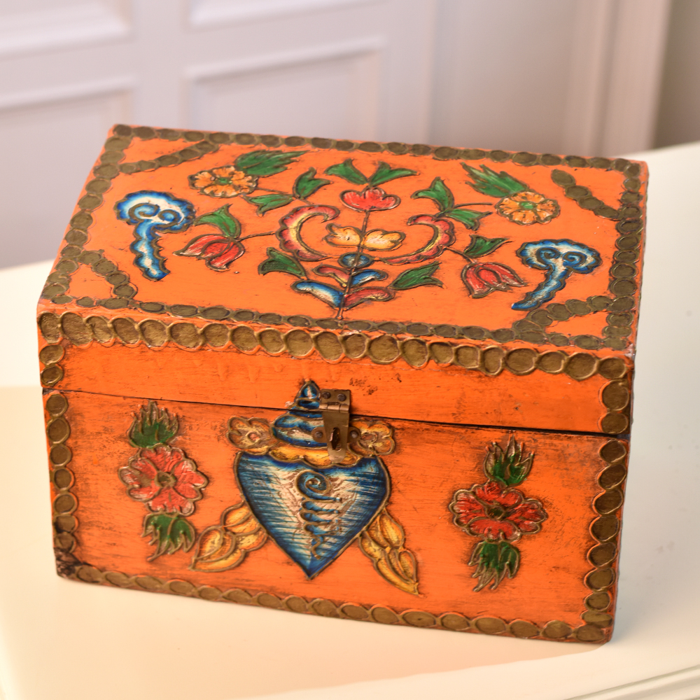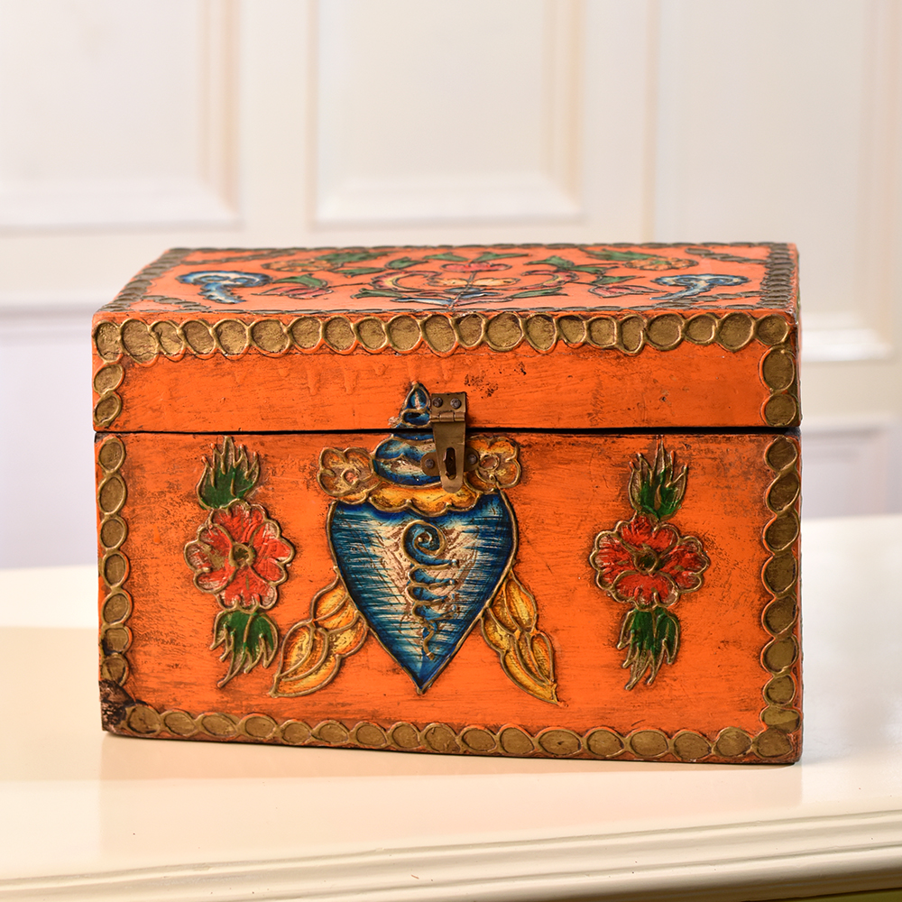 Buy a Wooden Square Box online from our website that is handcrafted by highly talented Indian craftsmen. Crafted with precision, this versatile box is designed for storing and showcasing your precious jewelry or small items with elegance. The square shape lends a timeless charm, while the secure latch ensures the safety of your cherished possessions. What sets this wooden box apart is its stunning multi-colour finish, adding a vibrant touch to any space. The intricate engraving of delicate shells and flowers enhances its appeal, creating a visually captivating piece that doubles as a work of art. This box is not just a storage solution, it's a decorative accent that effortlessly complements any setting. Ideal for home, office, cafe, restaurant, or hotel, this box seamlessly integrates into diverse environments. Its versatility extends to exhibitions, where its unique design becomes a conversation starter. Moreover, it makes for an impeccable gift, expressing love and thoughtfulness on special, festive, or auspicious occasions. Elevate your storage and decor game with this Wooden Square Box, a harmonious blend of craftsmanship and beauty.