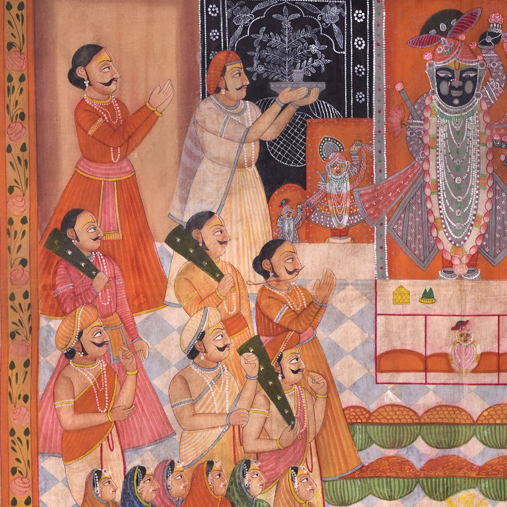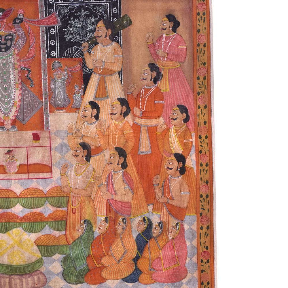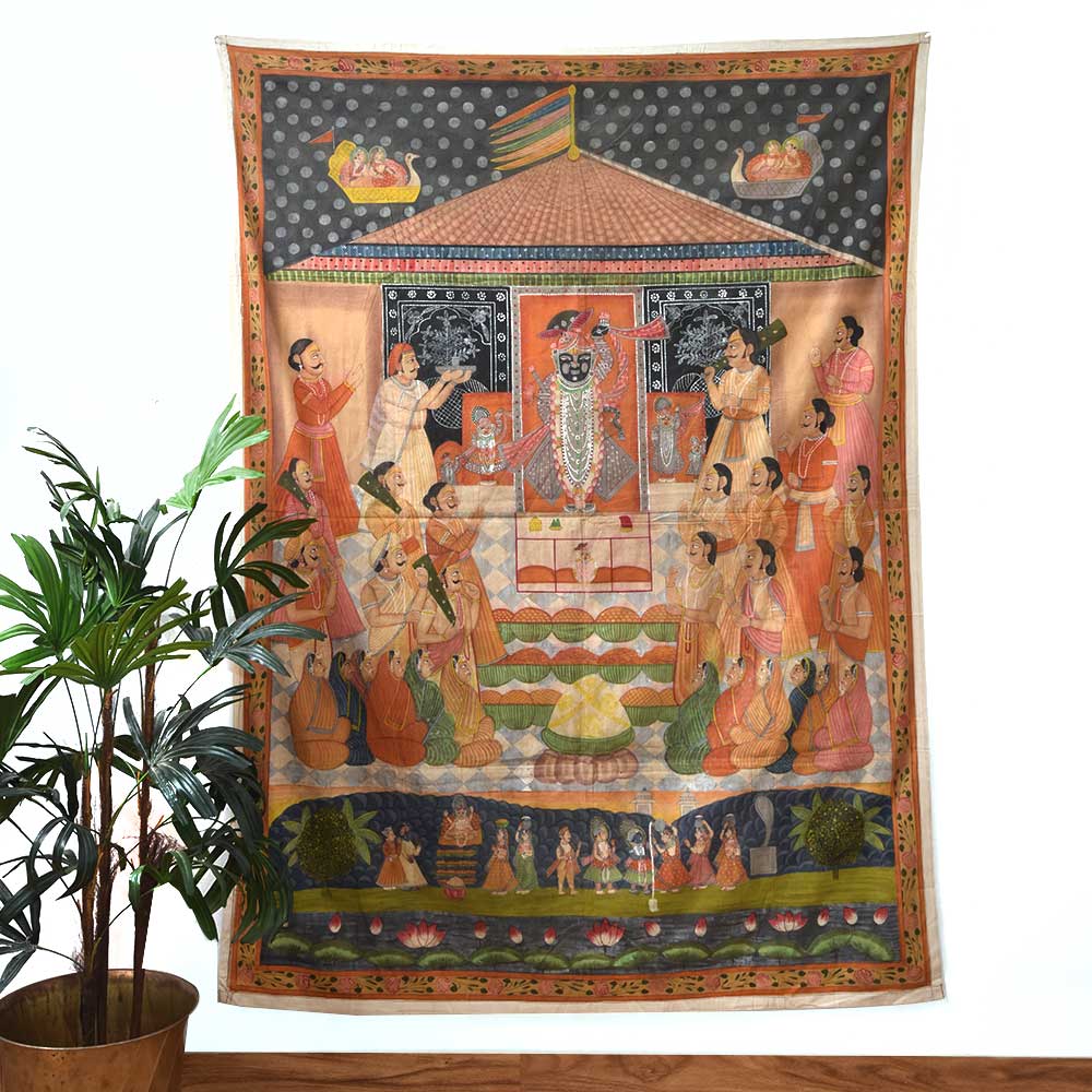 The Sreenathji Pichwai design painting of Aarti with followers and prasad portrays Lord Sreenathji surrounded by his devotees as they execute an aarti rite and present prasad (holy food) to the god. Painting is a traditional Indian art style that began in Rajasthan and is famous for its elaborate designs, vibrant colours, and religious importance. Lord Sreenathji, a manifestation of Lord Krishna, is usually represented in the centre, surrounded by his devotees, who are depicted in various stances of adoration, presenting flowers, candles, and prasad to the deity. The picture also includes ornamental themes such as lotus flowers, peacocks, and other birds, contributing to its visual appeal. The intricate workmanship and the use of natural dyes and colours are used in the creation of a Sreenathji Pichwai art painting. The painting's vivid and lively colours, including red, green, yellow, and gold, are derived from natural sources such as flowers, herbs, and minerals. The picture is not just a work of art but has significant religious importance for Hindus. It is said to bring wealth, happiness, and good fortune to the home or temple where it is displayed. The picture generates a spiritual atmosphere and aids in Lord Sreenathji's devotion. A great addition to any art collector's collection and a lovely way to decorate the walls of a temple or house.