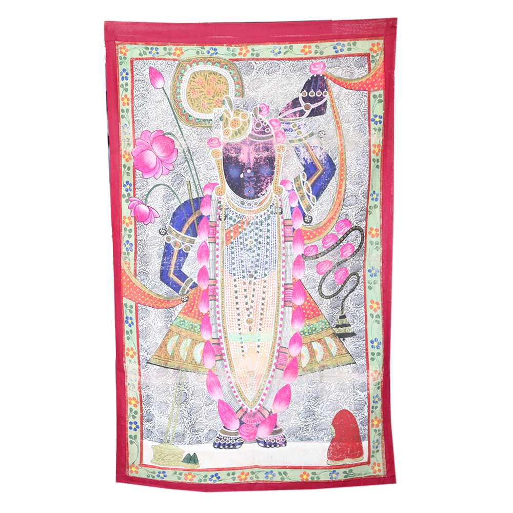Sreenathji Pichwai Painting in a traditional attire along with a garland of flowers and holding lotus flower. This painting is created by devotee-artists of Nathwara. Lord SreenathJi Pichwwai Painting is a very popular wall decoration for home, hotel and lobby decoration, temple decoration, conference hall, resort , Diwali gift, house warming gift and stage decoration.