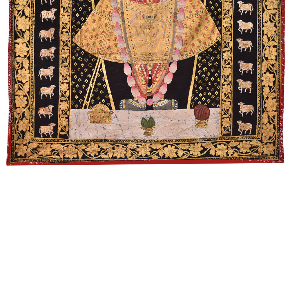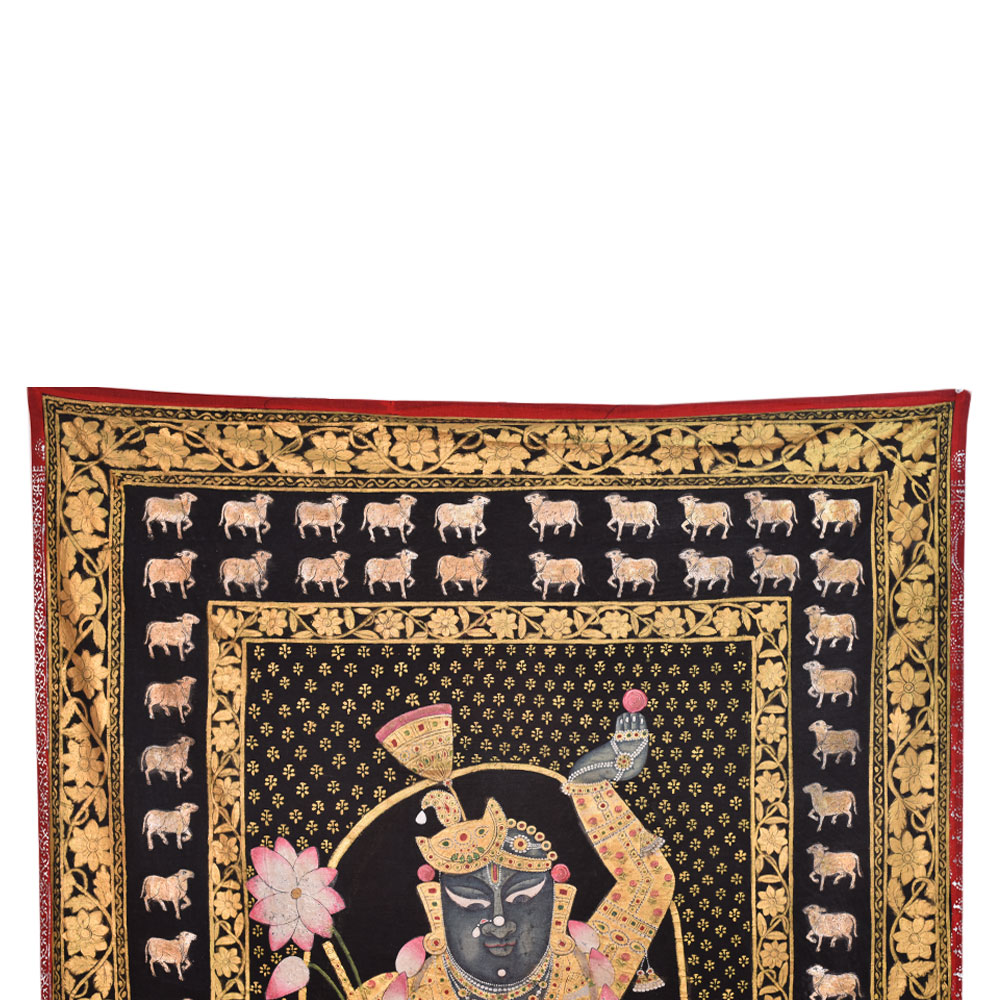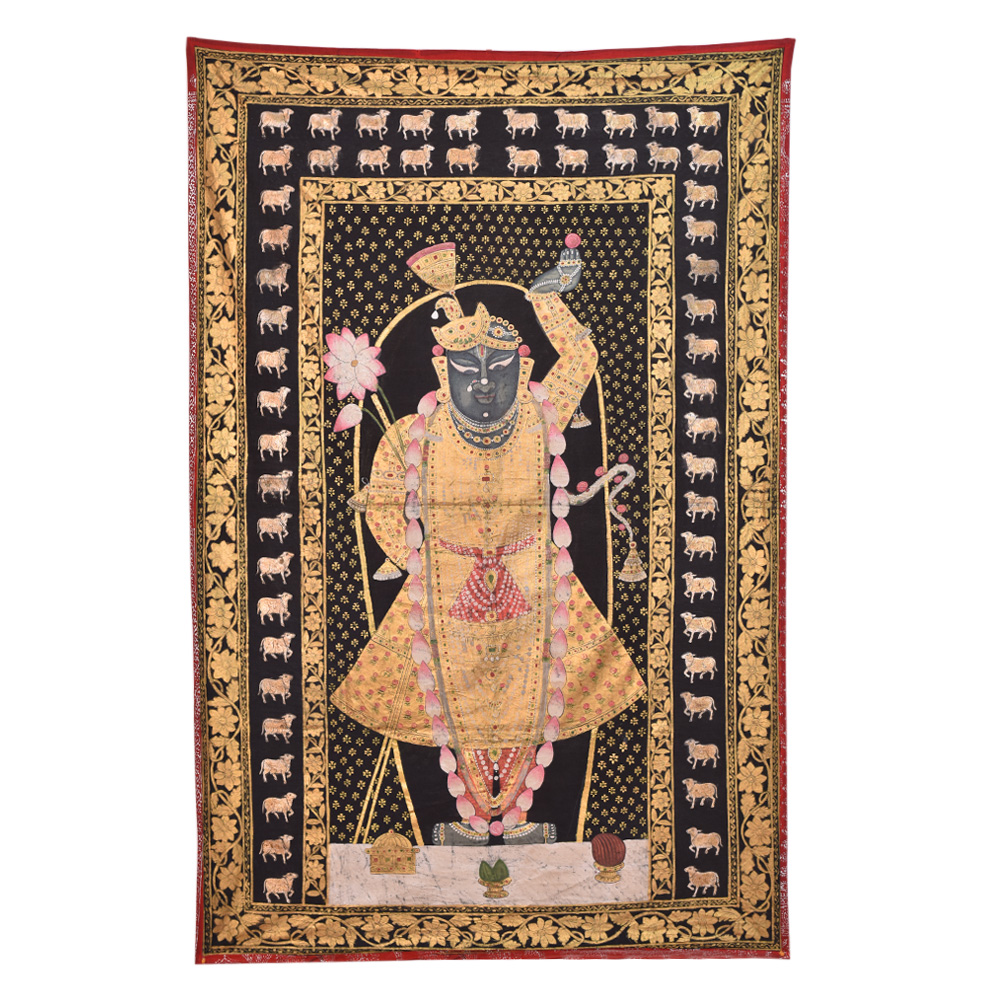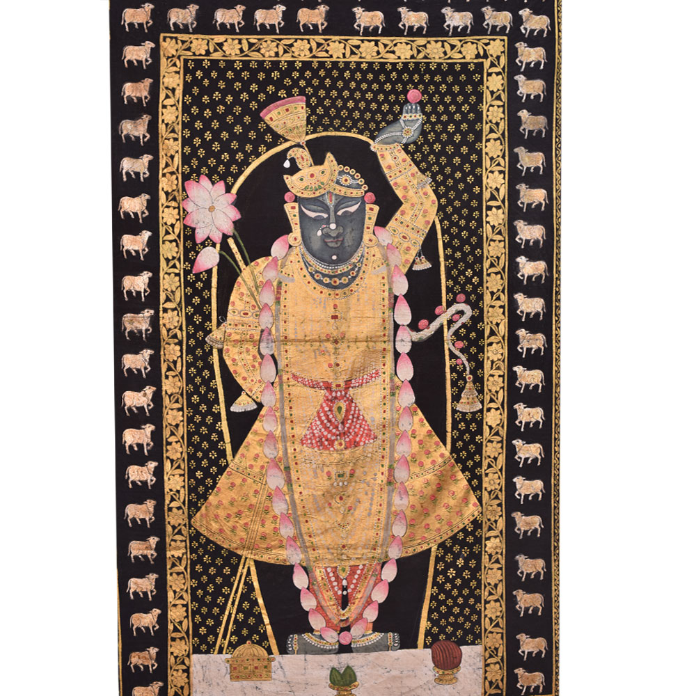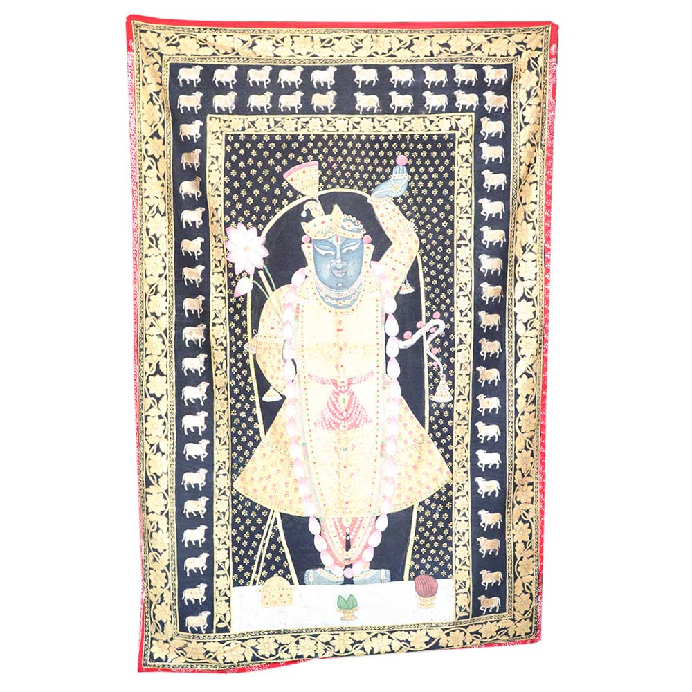 Shrinathji with Cows Pichwai Painting, The painting depicts a beautiful and elegant portrait of ShrinathJi wearing a garland. It also has Kamdhenu cows and flowers on the border. Pichwai's are intricate and stunning paintings usually made on cloth and originated in the town of Nathdwara. The Pichwai Paintings often portray Lord Krishna, also worshipped as ShrinathJi in Nathdwara, and Kamdhenu cow. This is perfect for Home Decor, Office, Shops, Showroom, Gifting, Return Gifts and Decorative purpose. This is the best gift for your near and dear ones.