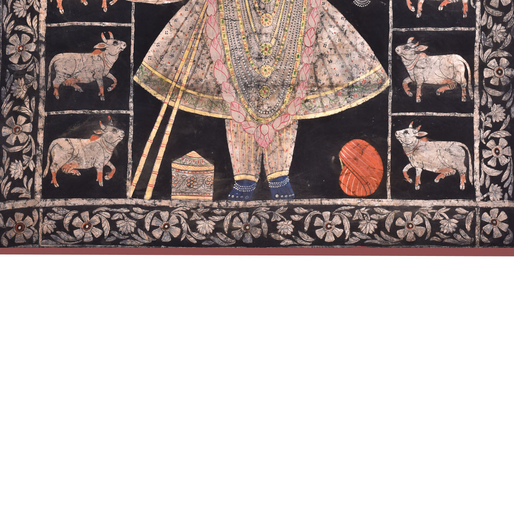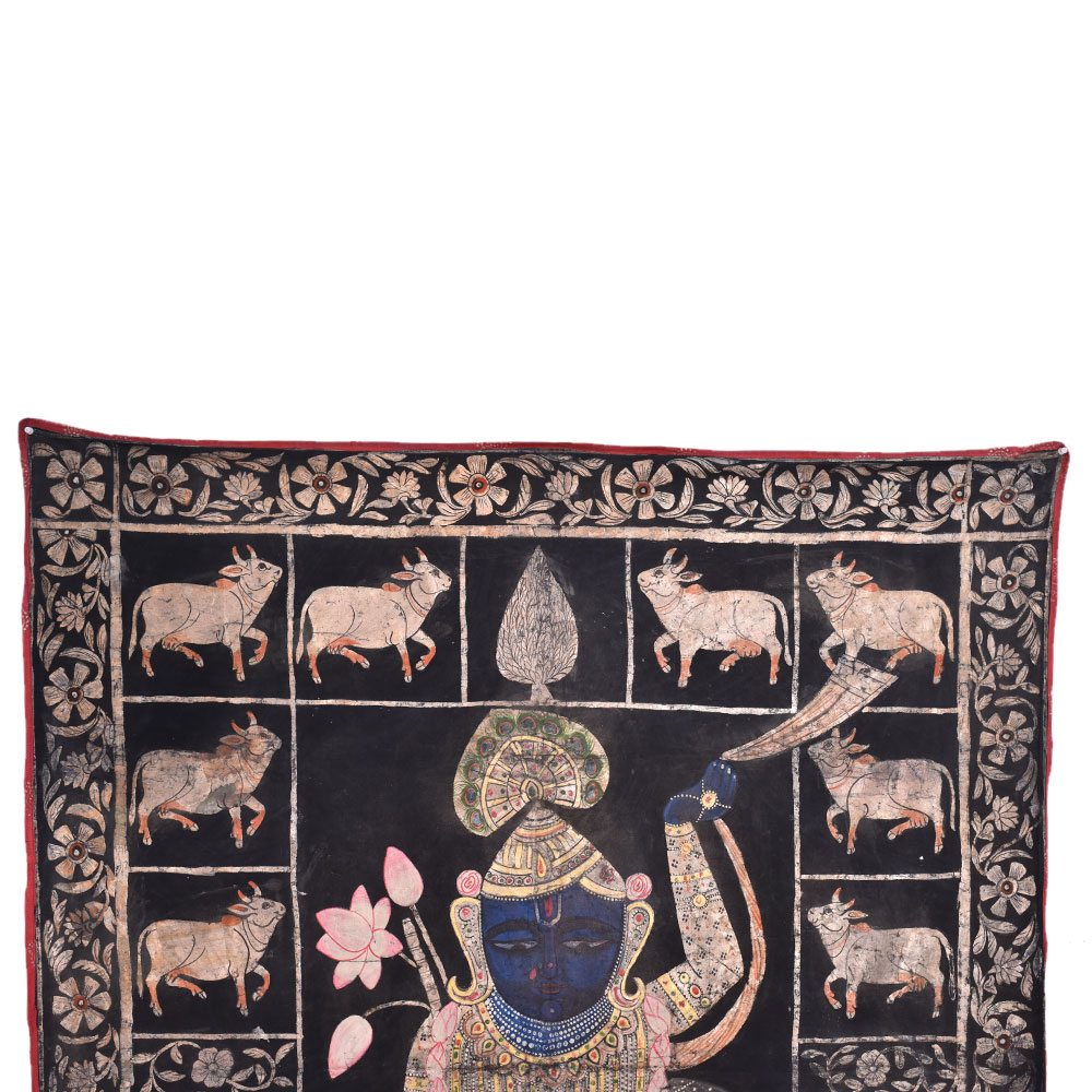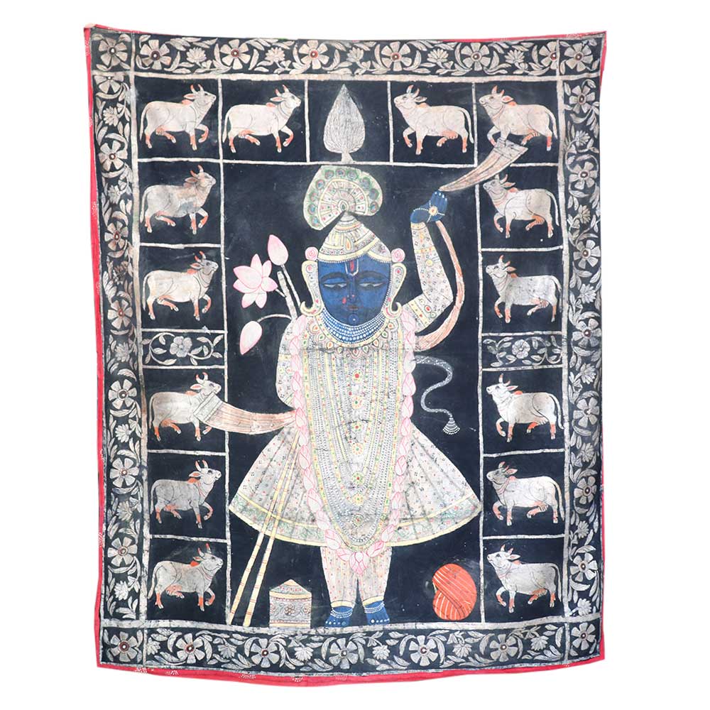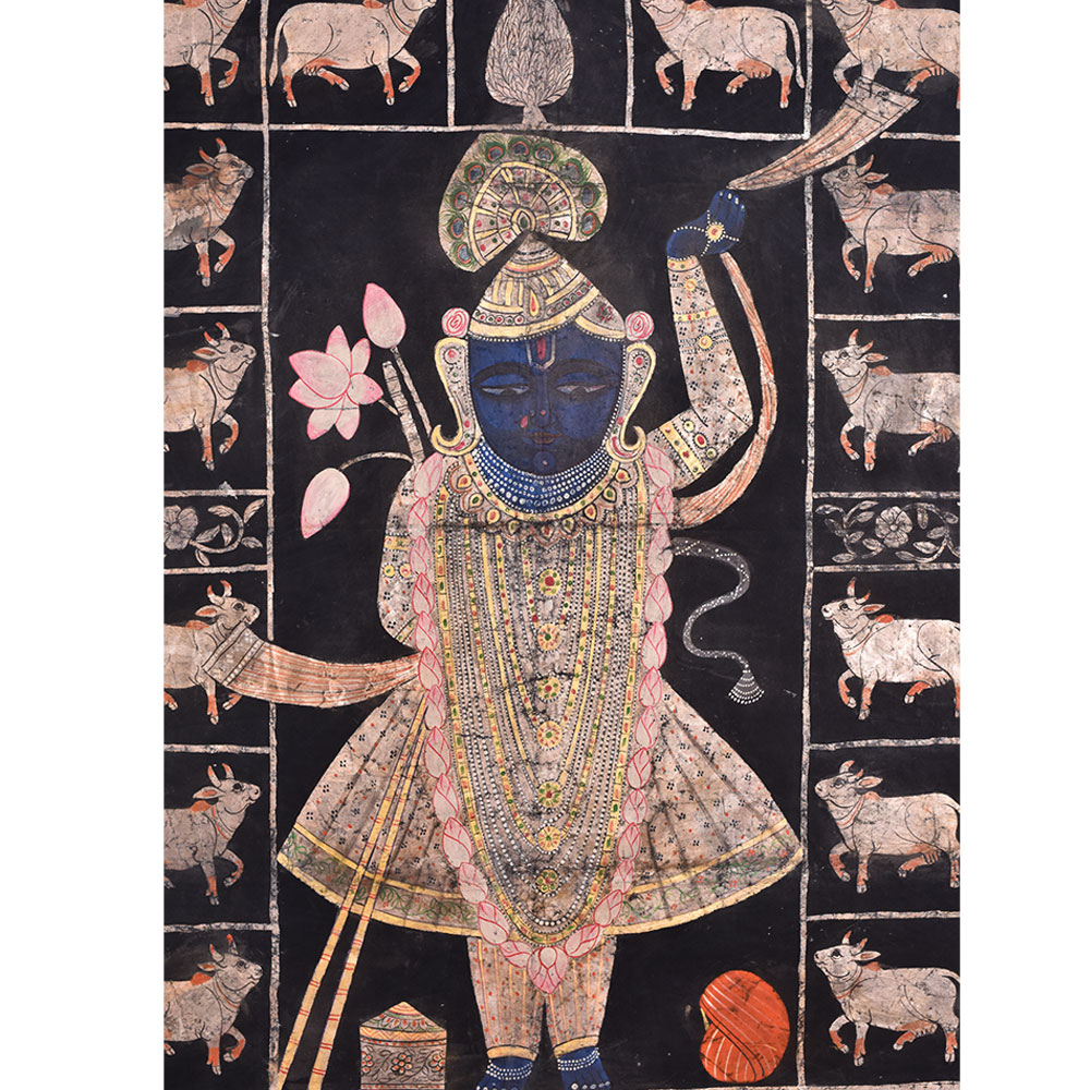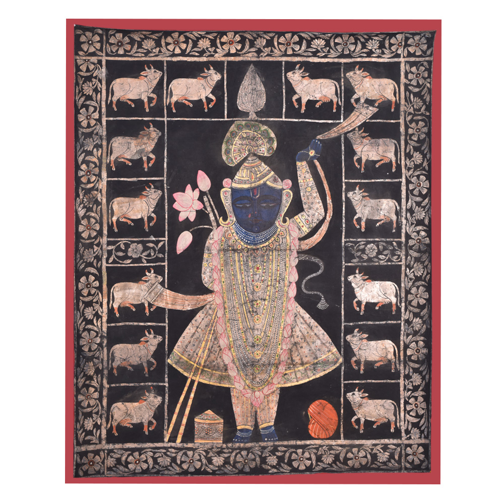 Srinathji Pichwai painting With Cows On Black Fabric for Interior decoration, wall art and hanging for the living room , temple decoration, hotel decoration, Diwali gift, New year gift , Wedding gift, stage decoration souvenir art and gift for your near and dear ones.