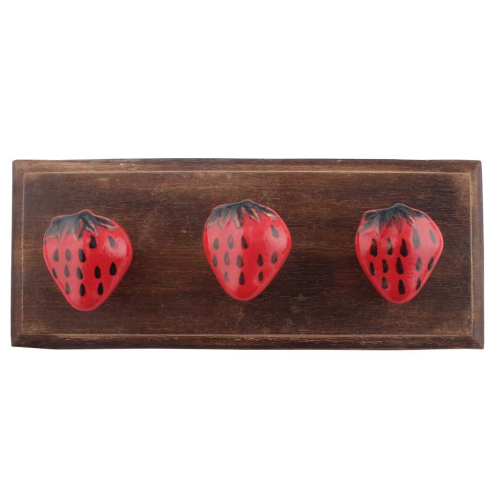 Strawberry Ceramic Wooden Hooks. A Perfect Complement to the Soft Tone of the Wood are these White Traditional Hat and Coat Hook Made of Genuine Porcelain and Brass. It can be used to Hang Jewelry, Leashes, Towels, Scarves, Light Weight Sweaters, Caps etc.