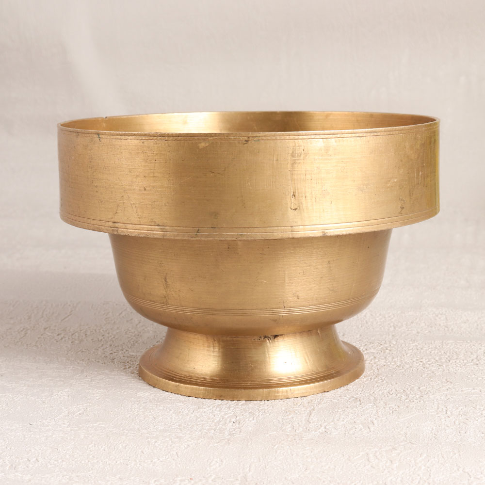 A vintage brass holy pot which is a testament to the timeless craftsmanship of professional Indian artisans from South India. Crafted with precision and passion, this holy pot showcases the artistry and dedication of its creators. With a charming antique brown finish, this pot not only serves as a vessel for sacred offerings but also as a versatile decorative piece. Place it in your home, office, hotel, cafe, shop, or restaurant's prayer room, infusing the ambiance with an aura of spirituality and tradition. This multifunctional artefact can be used for prayer rituals, offering a sacred connection to the divine. It also doubles as a small flower pot, adding a touch of elegance to your decor. This vintage brass holy pot is a valuable addition to any collector's trove and makes an excellent exhibit piece. Moreover, it's a thoughtful gift for your family, friends or relatives on special, festive, or auspicious occasions, spreading the essence of tradition and craftsmanship. Embrace a piece of India's rich heritage and culture with this extraordinary holy pot.