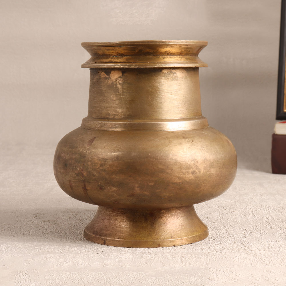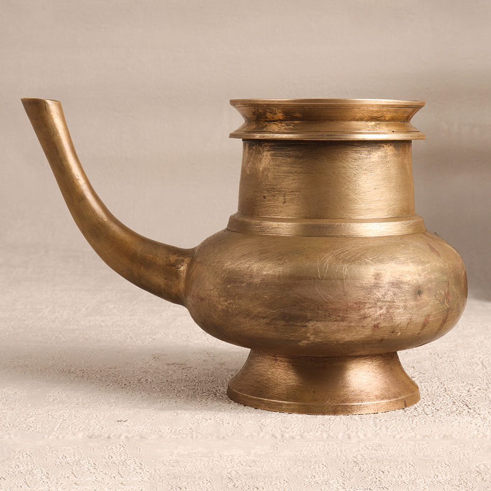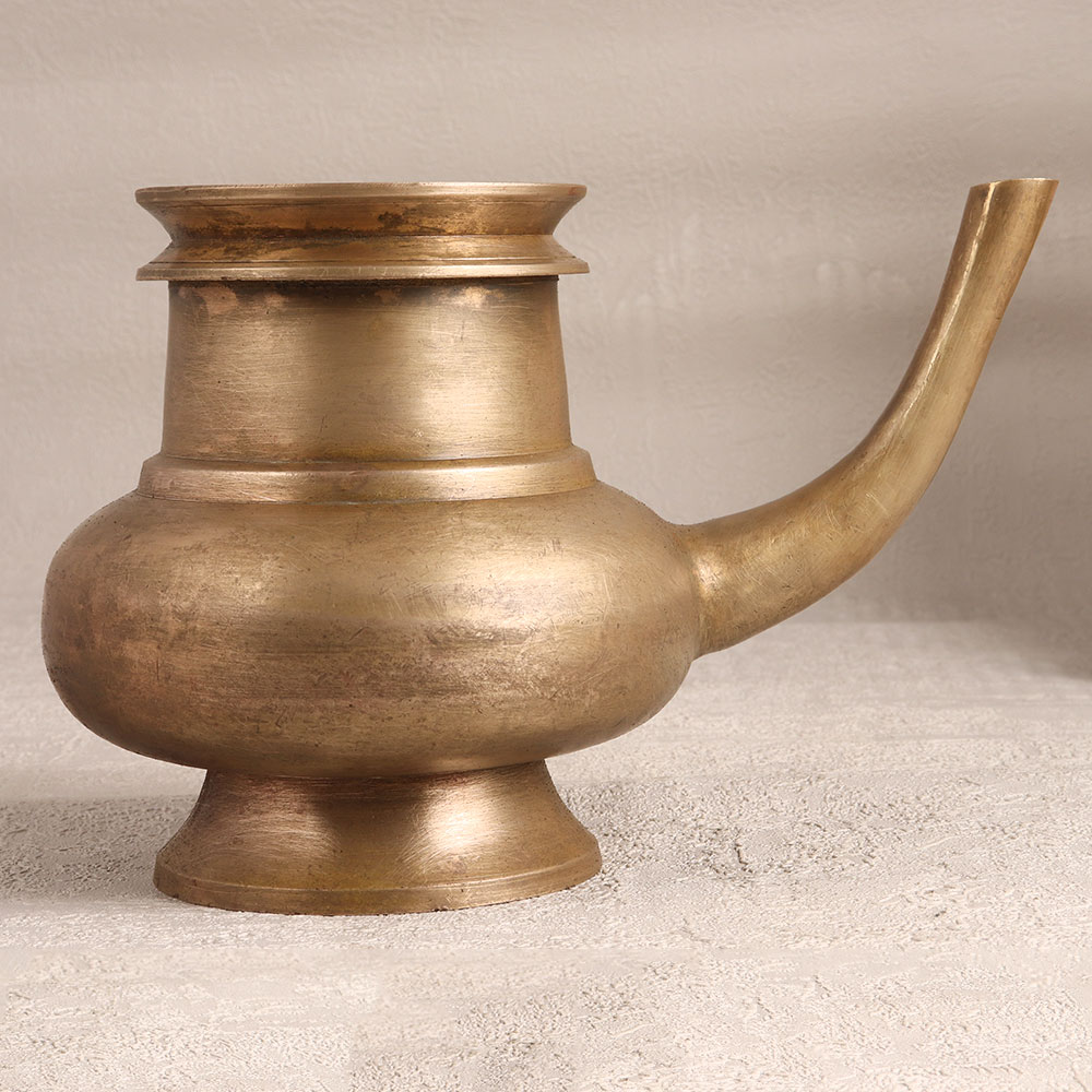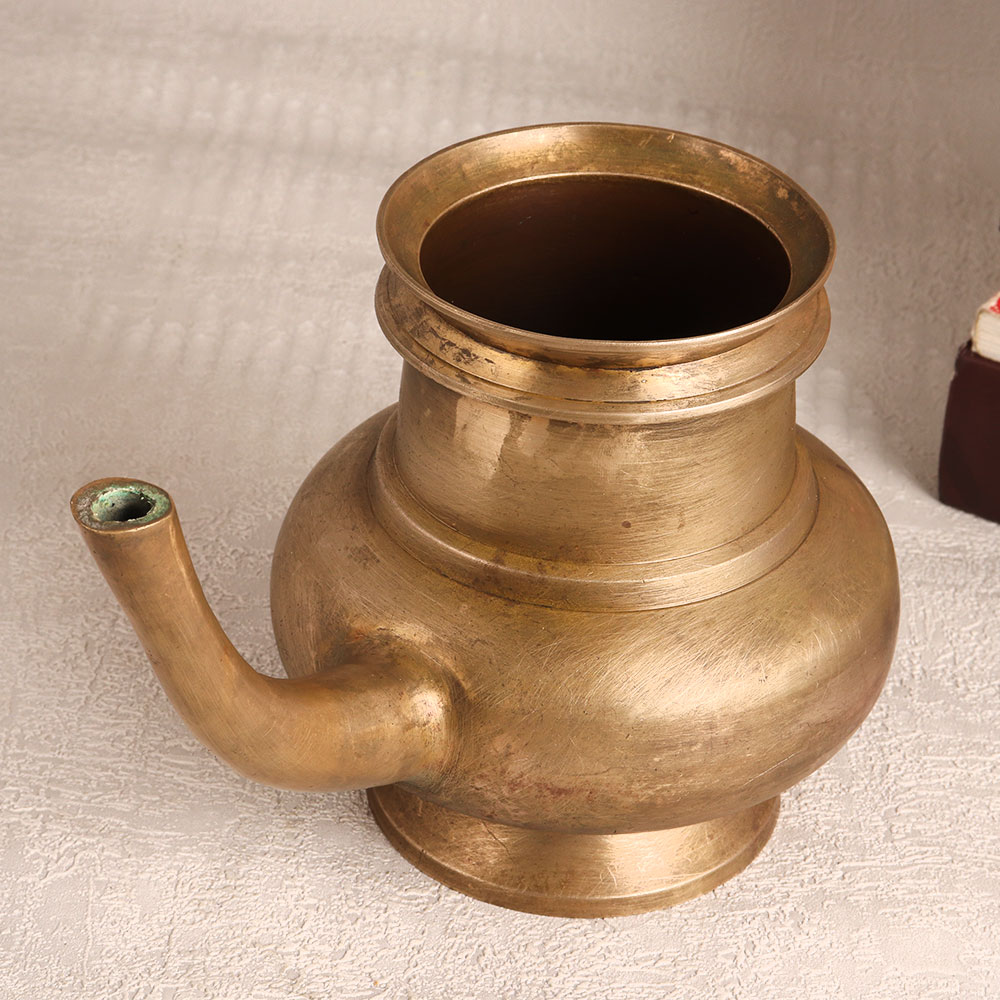Adorn your spiritual space with the timeless elegance of the Vintage Brass Holy Water Pot which is affectionately known as the Sagar Pot. Meticulously handcrafted by skilled Indian artisans in the revered South Indian Art tradition, this pot is a masterpiece in antique brown finish brass. Its graceful design and intricate detailing transport you to an era where craftsmanship was an art form. Traditionally used during prayer to hold holy water, the Sagar Pot is a symbol of sanctity and reverence. Its versatile spout allows for precise pouring, adding a touch of ritual to your sacred moments. Beyond its spiritual significance, this pot serves as a stunning vessel for flower decoration, exuding an aura of sophistication. Made from high-quality brass, the pot promises durability and a rich, authentic aesthetic. Whether adorning your home, office, restaurant, hotel, or cafe, this piece seamlessly integrates into any space, turning it into a haven of serenity. A thoughtful addition to any vintage collection, it makes for an exquisite and meaningful gift for your family, friends or relatives on special, festive, or auspicious occasions, ensuring they receive a timeless treasure that transcends time and tradition.