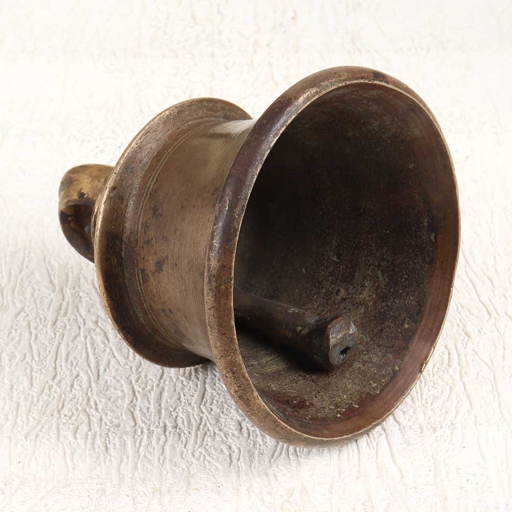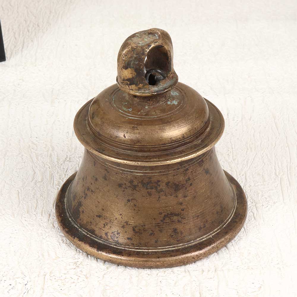 Transform any space into a peaceful oasis with this vintage bell metal temple bell. Lovingly handcrafted in Himachal Pradesh, India, this bell's soothing tones will relax your mind and refresh your spirit. The temple bell's vintage patina brown finish gives it an earthy, timeless look. Hang it by a window or doorway and let gentle breezes create soothing chimes. Use it to start your meditation practice, call family to dinner, or demarcate sacred space. Let this special bell fill your home with tranquility. Its minimalist yet elegant design highlights the beautiful, resonant tone that uplifts and inspires. Transform daily life into ritual with this meaningful piece of Indian craftsmanship.