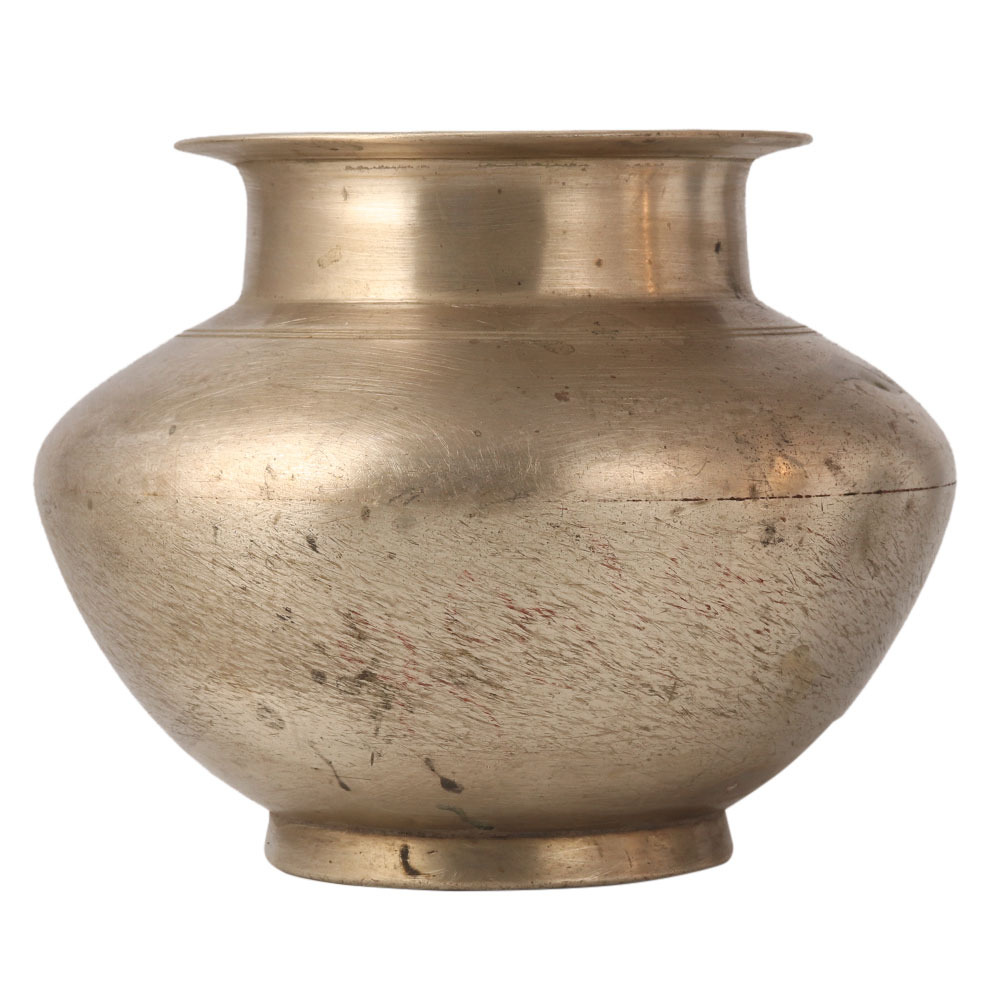 This sturdy looking Gangajal water pot has a vintage style appearance. It was carved from a white metal alloy. It is used to pour water on the Shivling in temples. It is also used to store holy water from the river Ganga. Decorate your home and use it as a flower pot on the table or shelf.