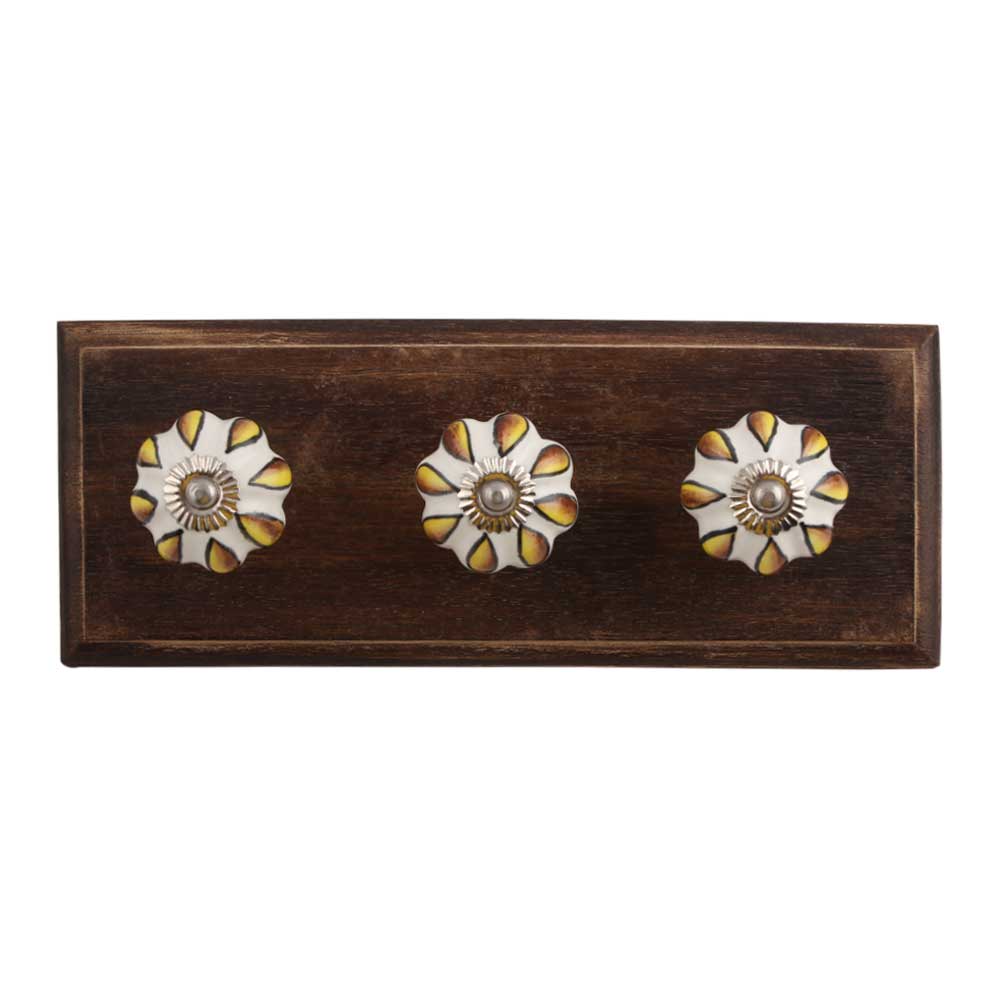 Sunflower Ceramic Wooden Hook. A Perfect Complement to the Soft Tone of the Wood are these White Traditional Hat & Coat Hook Made of Genuine Porcelain and Brass. It can be use to Hang Jewellery, Leashes, Towels, Scarves, Light Weight Sweaters, Caps Etc.