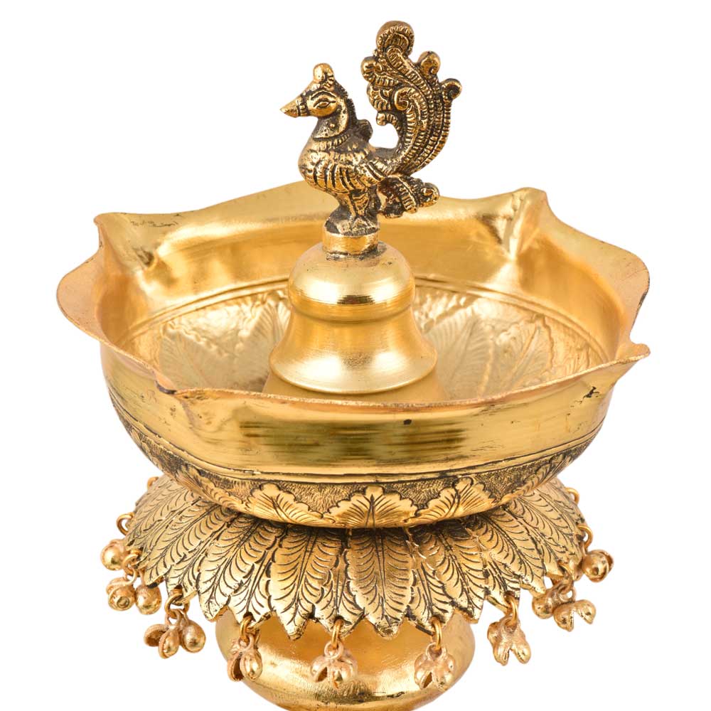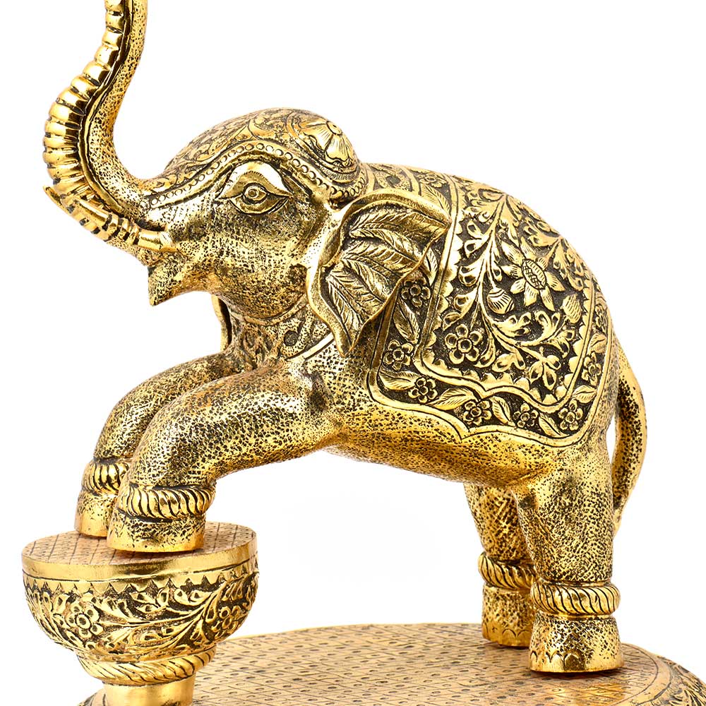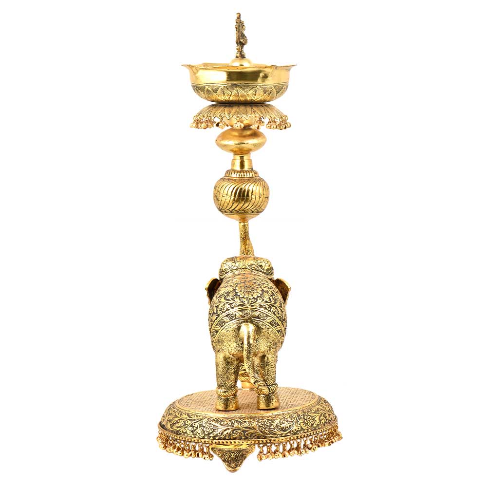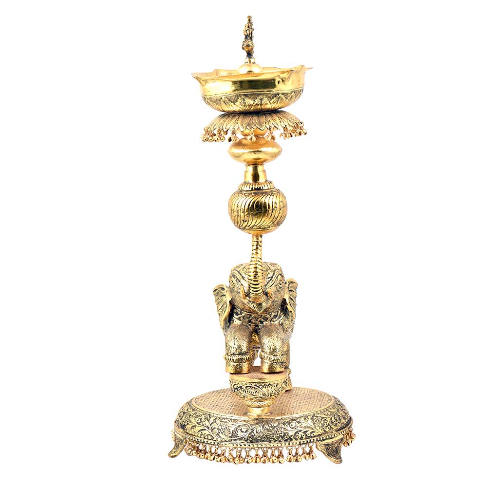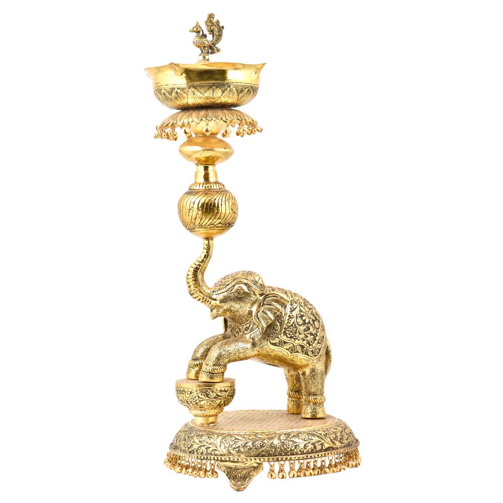 Created by the finest artisans this tall brass lamp are designed and crafted using the finest quality brass using traditional methods. They look very elegant and used during auspicious functions like wedding and other religious ceremonies. The top of the lamp is used to fill with ghee or oil with peacock figurine and the bottom is further decorated with an elephant with his one foot on the stool and the other on the ground. To add a glamour quotient it is decorated with leaves and plenty of ghungoos.