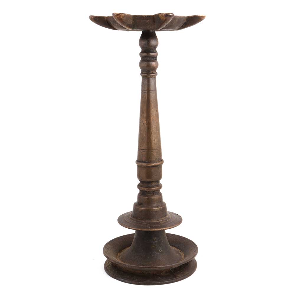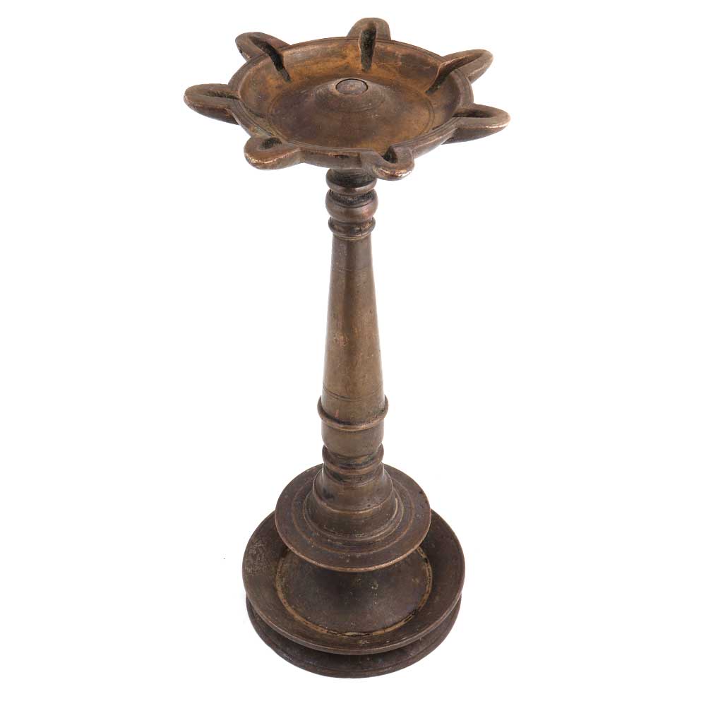 Tall Brass Lamp Seven Lights Wicks Worship Lamp made by the local craftsmen of south India in lovely color to give a festive look to your home, hotel, restaurant, spa, wedding stage, inaugural function . Wedding gift, house warming gift or souvenir.