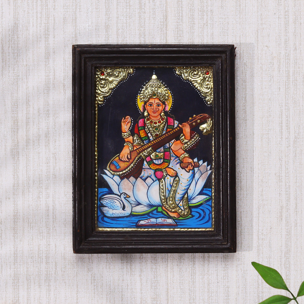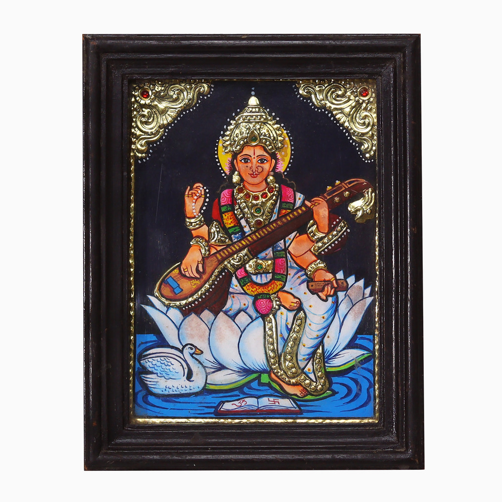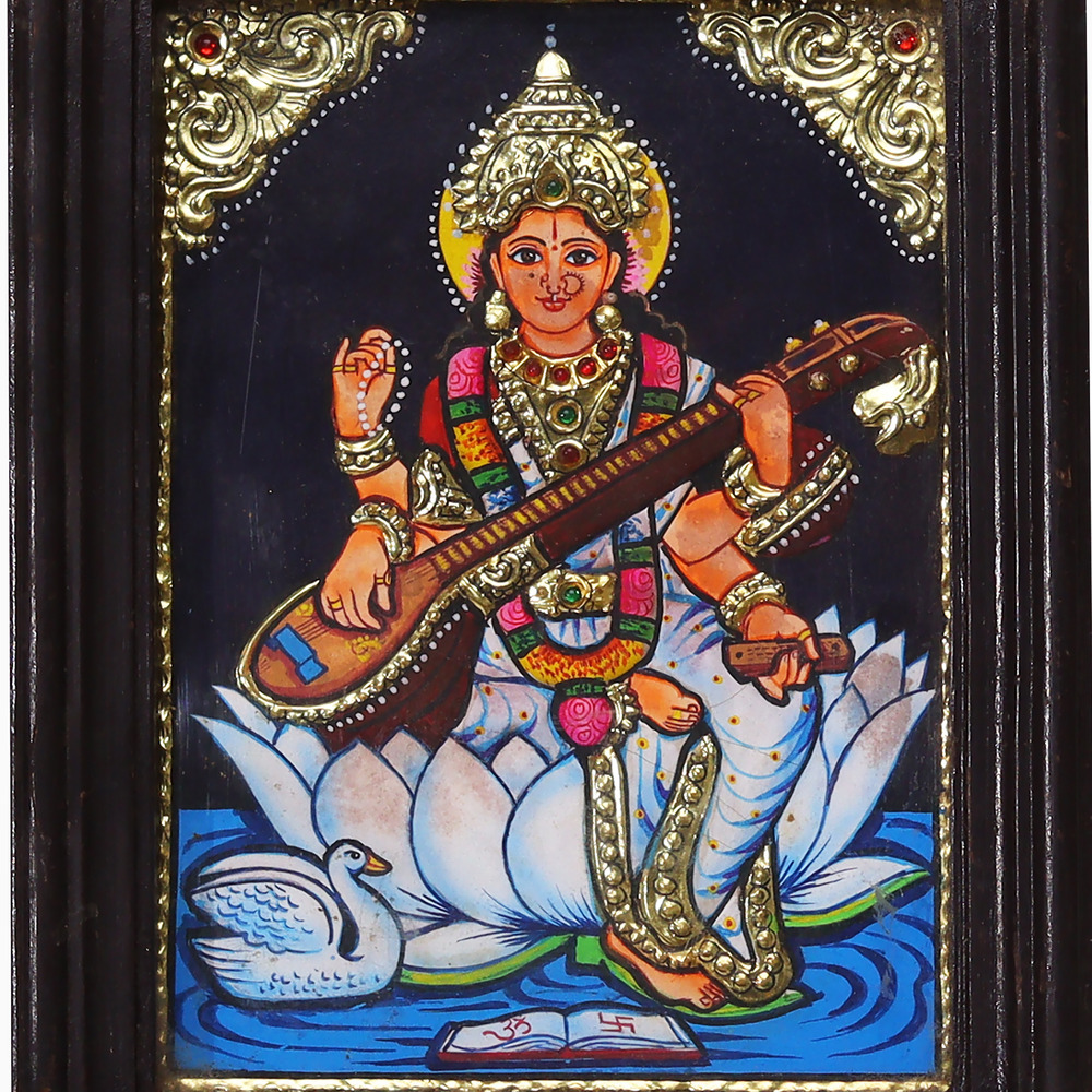 Infuse your space with the transformative energy of the Goddess Saraswati through this breathtaking Tanjore painting. Masterfully crafted with intricate gold detailing, this vibrant depiction of the divine feminine will captivate all who behold it. As you gaze upon this sacred artwork, feel your creativity and intellect surge. Saraswati, the Goddess of wisdom, music, and the arts, bestows her blessings upon all who honor her. Let this painting be your muse, igniting your passion for self-expression and lifelong learning. Whether displayed in your home, office, or studio, this Tanjore Saraswati painting will transform your environment into a sanctuary of inspiration. Surround yourself with the Goddess' divine energy and watch as your ideas flow, your skills sharpen, and your connection to the creative realm deepens. Invite the gifts of knowledge and artistic mastery into your life with this stunning spiritual centerpiece.
