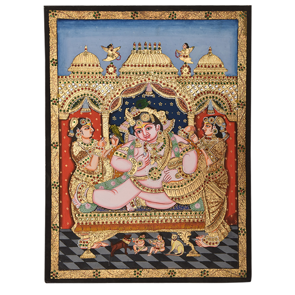 A spectacular gold finish handmade Tanjore painting of young Lord Krishna in the act of eating butter. Tanjore Art Is Known for Its Rich, Flat, And Vivid Colours and iconic composition. They are preserved as valuable antiques because they are believed to bring Good Luck to the home.