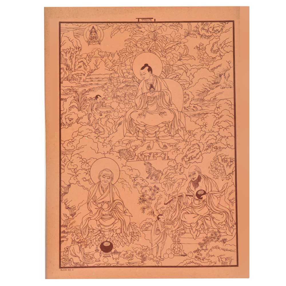 An old buddha painting made on beige showiing the life an stages of gautam buddha .It is a very old painting probably made by hand and the beauty of the image is no place is empty and the entire frame is filled with landscsape beauty and scenes.