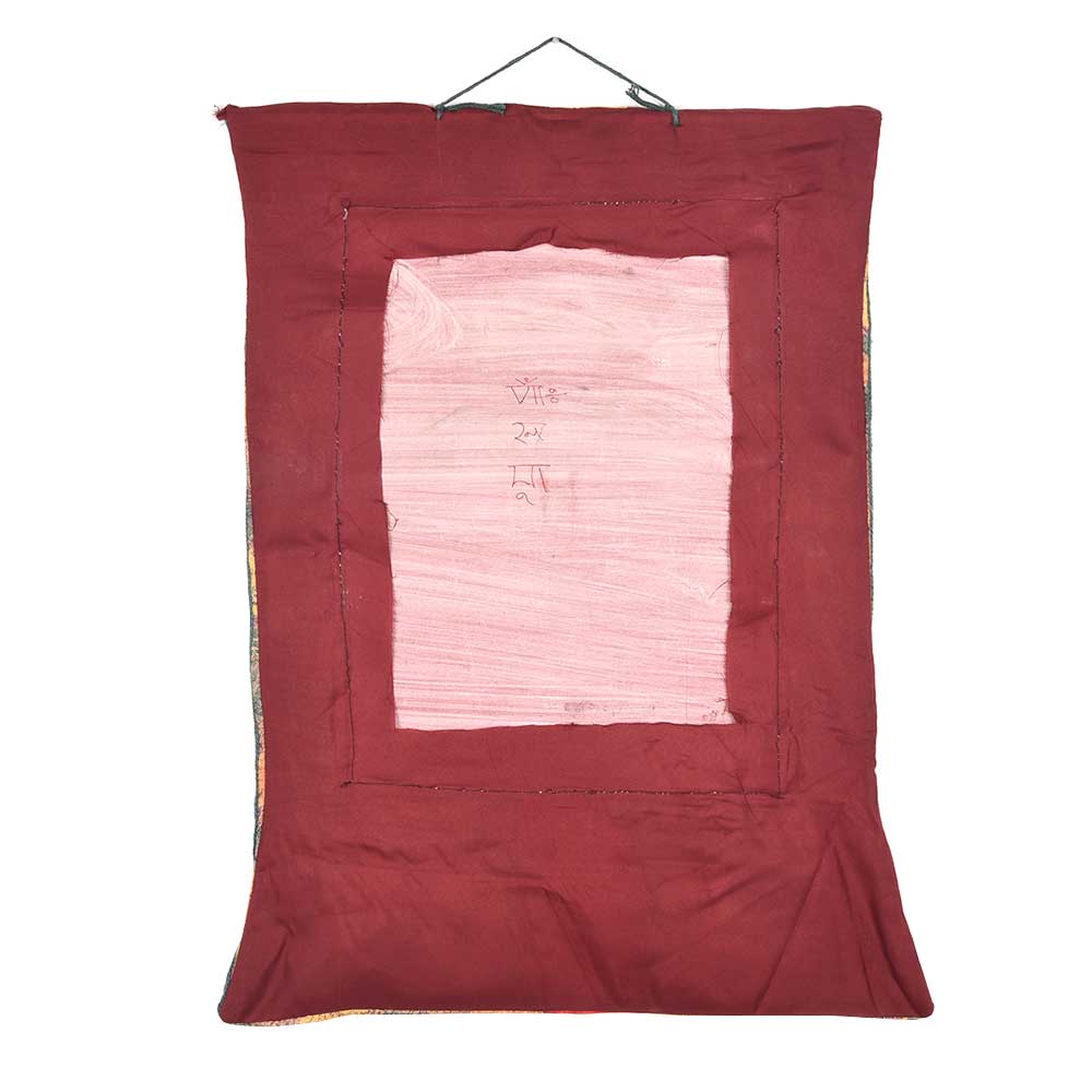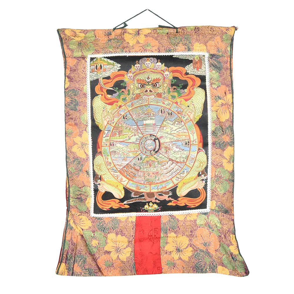 The entire 'Wheel of Life or Existence' (bhavachakra) is grasped in the claws of a wrathful red demon (mara) that devours the wheel with his sharp teeth to symbolize the ultimate impermanence or temporality of all cyclic existence.