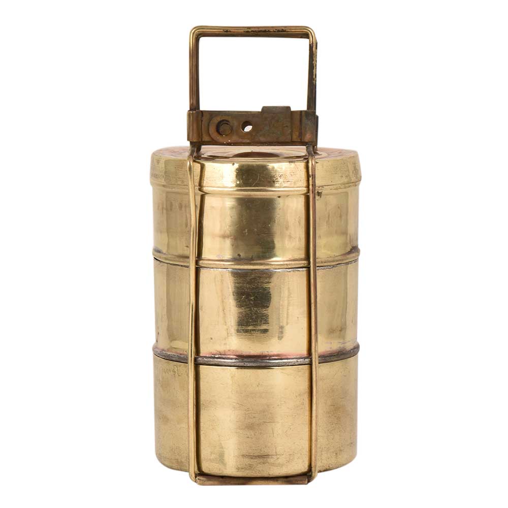 The brass three compartments Tiffin box is made of very high quality brass it comes with three storage boxes that are stacked one above the other opened by unlocking a simple catch on the either handle and then removing it . Now used as a table ornament, jewelry storage and for presentation of food.