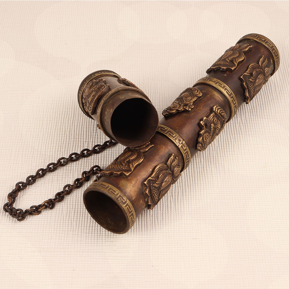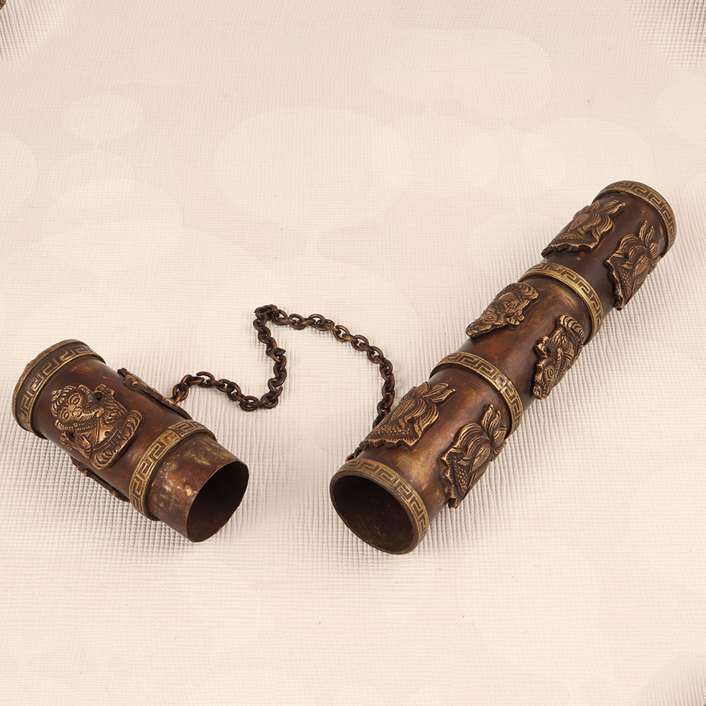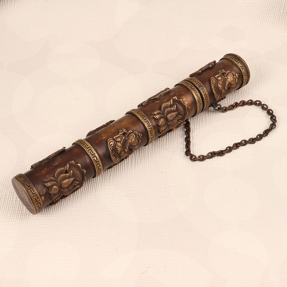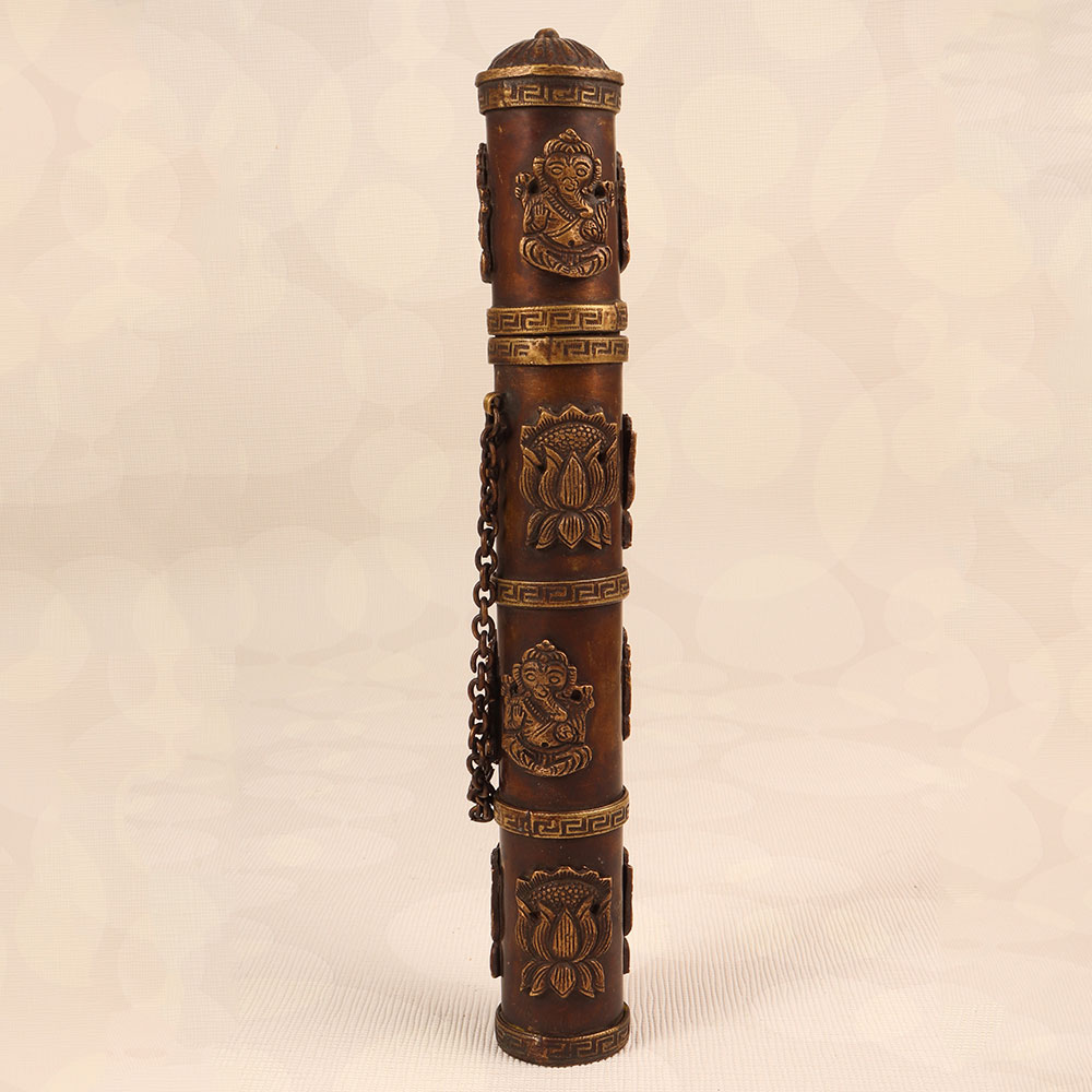 Buy a Brass Copper Incense Case online that is a magnificent piece of functional art meticulously crafted by skilled Tibetan artisans. Fashioned from high-quality brass and copper, this incense case boasts an exquisite antique brown finish that adds a touch of timeless elegance to any space. The case is adorned with intricate engravings of Lord Ganesha, the revered deity symbolizing wisdom and prosperity, and delicate Lotus carvings, representing purity and enlightenment. These artistic details not only elevate the aesthetic appeal but also infuse a spiritual aura, making it a perfect addition to prayer rooms at home, offices, restaurants, hotels, or cafes. Handmade with precision, each incense case is a testament to the artisan's dedication to preserving the rich heritage of Tibetan Art. Beyond its functional purpose of holding incense sticks, this case serves as a striking decor piece, enhancing the ambiance of any environment. Ideal for special, festive, or auspicious occasions, the Brass Copper Incense Case makes for a thoughtful and meaningful gift. Its cultural significance, combined with meticulous craftsmanship, ensures a cherished and enduring token for your family, friends or relatives. Embrace the divine and aesthetic qualities embodied in this exceptional piece, creating an atmosphere of serenity and beauty wherever it resides.