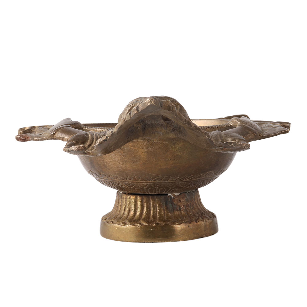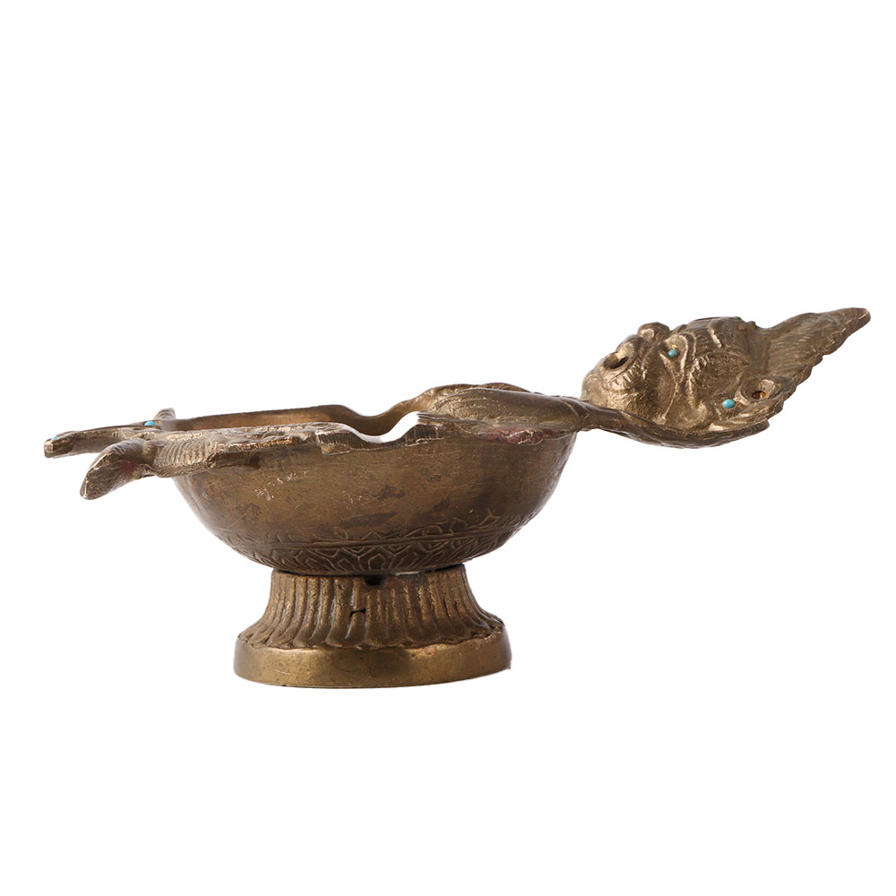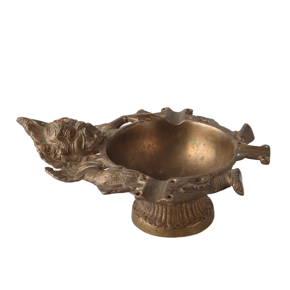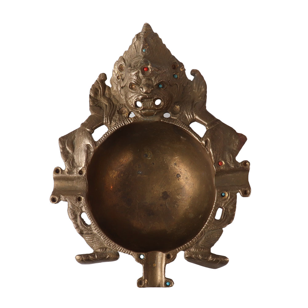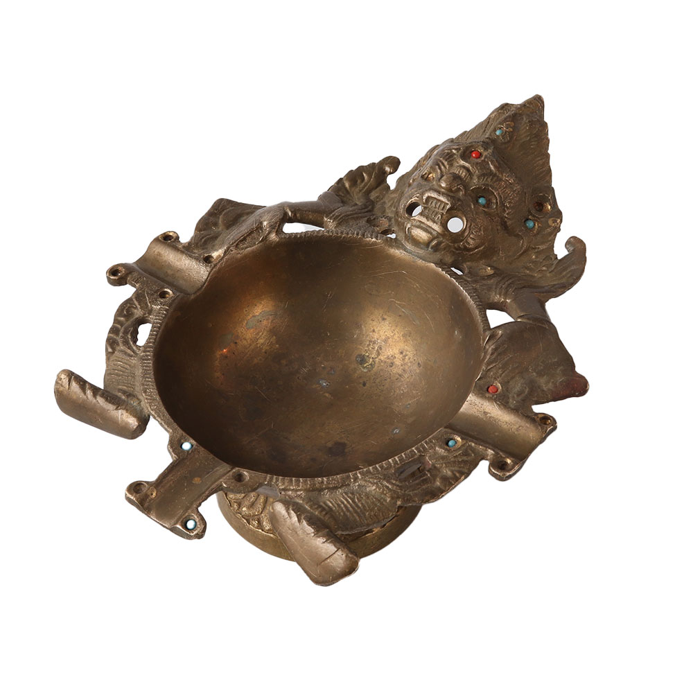 Handcrafted intricately carved brass ashtray in the shape of Mahakala , a Buddhist deity with decorative edges embedded with tiny stones.  The face on this brass ashtray resembles Mahakala, the Tibetan protector god, rather than a demon. The Tibetan god Mahakala has four arms. In Himalayan Vajrayana Buddhism, there are several terrifying-looking protective Gods. The feel is heavy and solid. An elegant present for family and friends. It has three cavities to hold cigarettes .