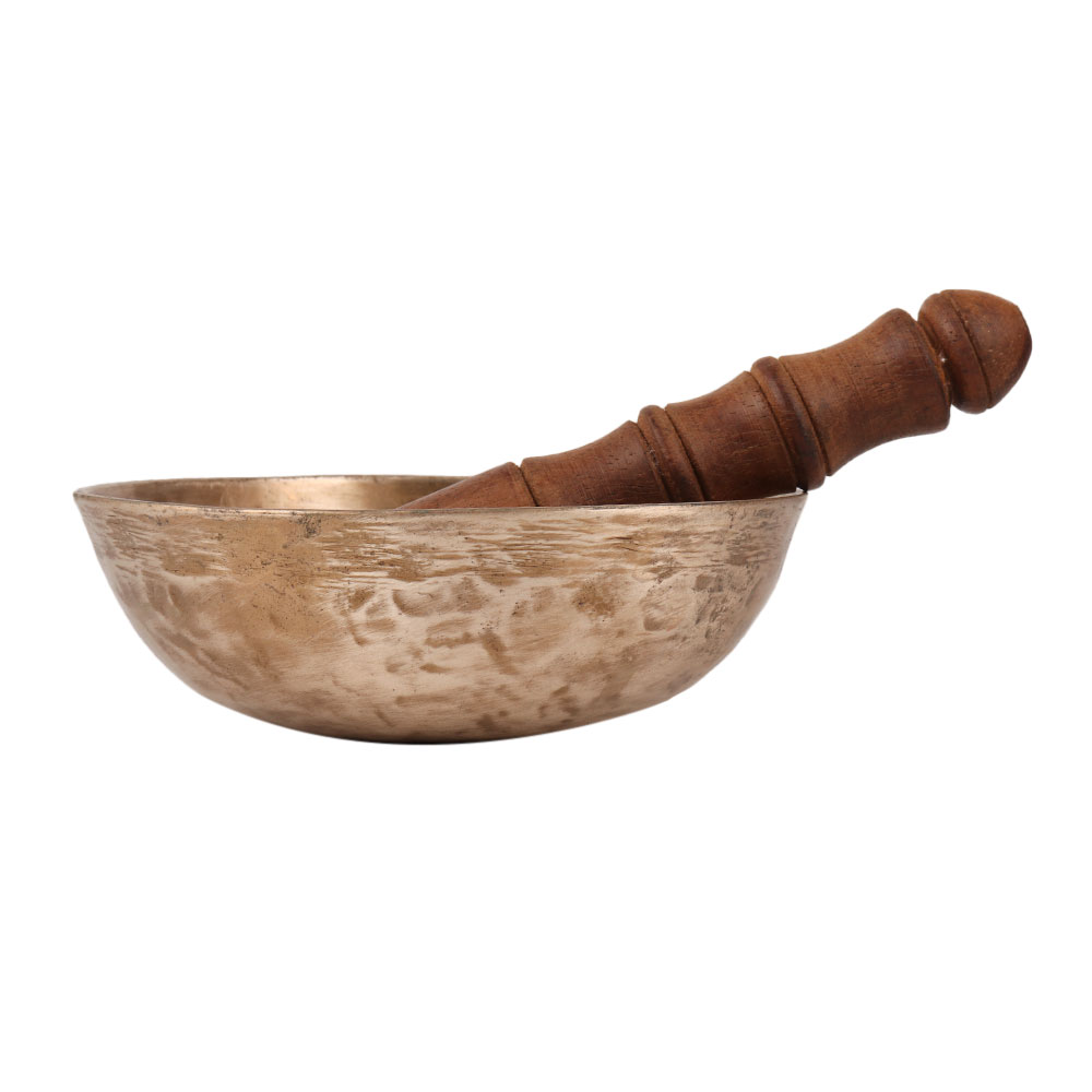 Discover the power of sound healing with this Om singing bowl and wooden mallet set. The bowl's harmonic tones and the rhythmic vibrations it produces are known to promote relaxation, stress relief, and focus during meditation. Handcrafted with attention to detail, this beautiful bowl features antique finish, making it a meaningful and thoughtful gift for family, friends and relatives ones on special and festive occasions who value their well-being and spiritual practices. Add this incredible bowl in your vintage art collection. It is made by local Indian artisans from high quality bell metal with their hands that leaves a long lasting impression to the decoration.