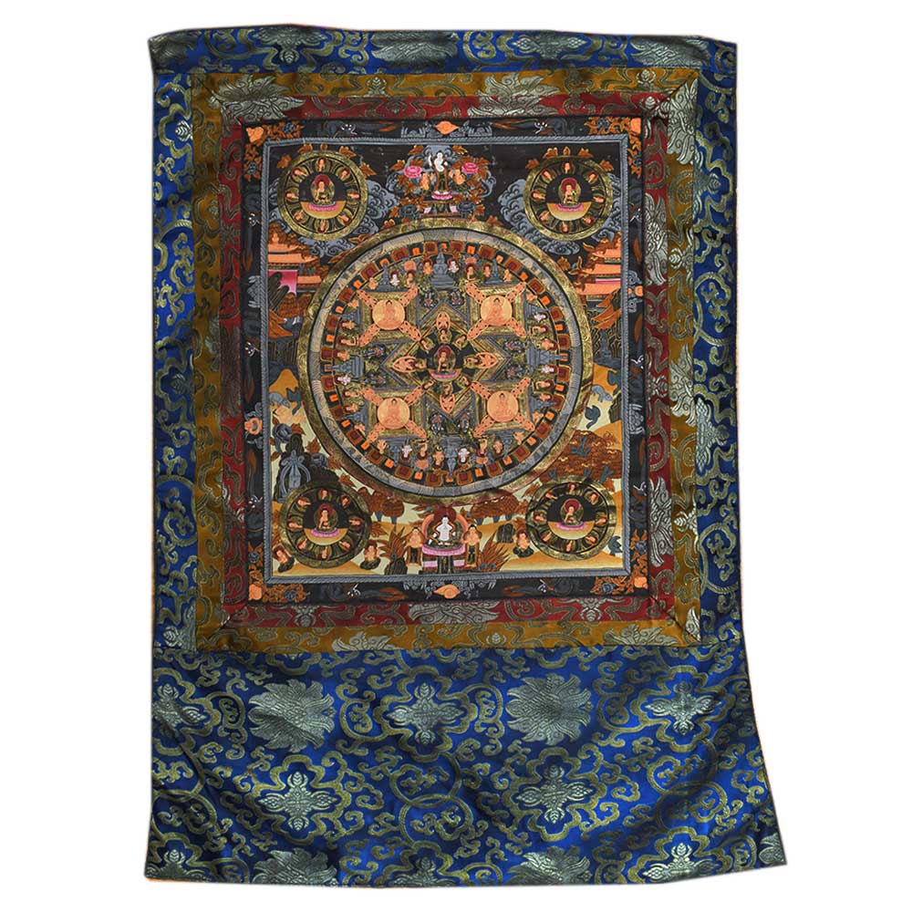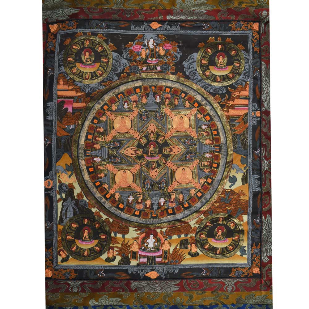 The Five Dhyani Buddha Mandala is another name for this Buddha Mandala Thangka. Mandalas are employed for meditation practise in Vajrayana, and the Five Dhyani Buddhas are frequently represented. The Five Tathagatas are transcendent creatures who embody the five virtues of the primordial Buddha Vairocana and are located in the Mandala's centre. This mandala, often known as the five-circle mandala, is designed to help people meditate.