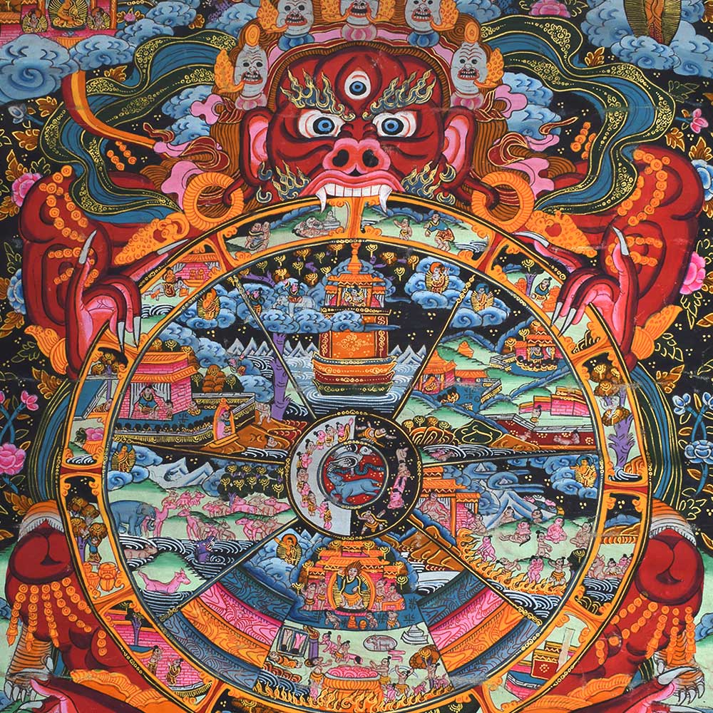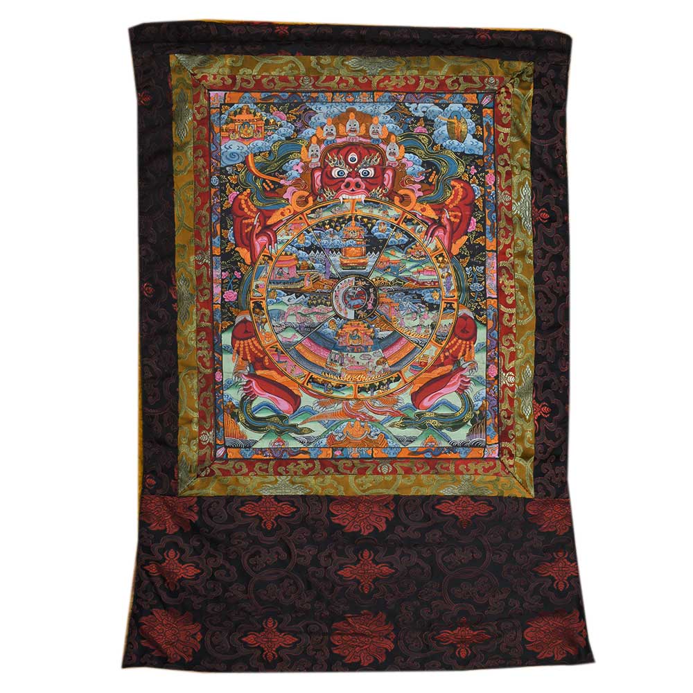 In the Indo-Tibetan region, the wheel of life is a symbolic image of cyclic existence found on the outside walls of Tibetan Buddhist temples and monasteries. This visual thangka explains key Buddhist principles like karma and rebirth in a way that even unskilled or illiterate people can understand. With one face and two hands, the enormous crimson form of a personalized Samsara is vengeful.