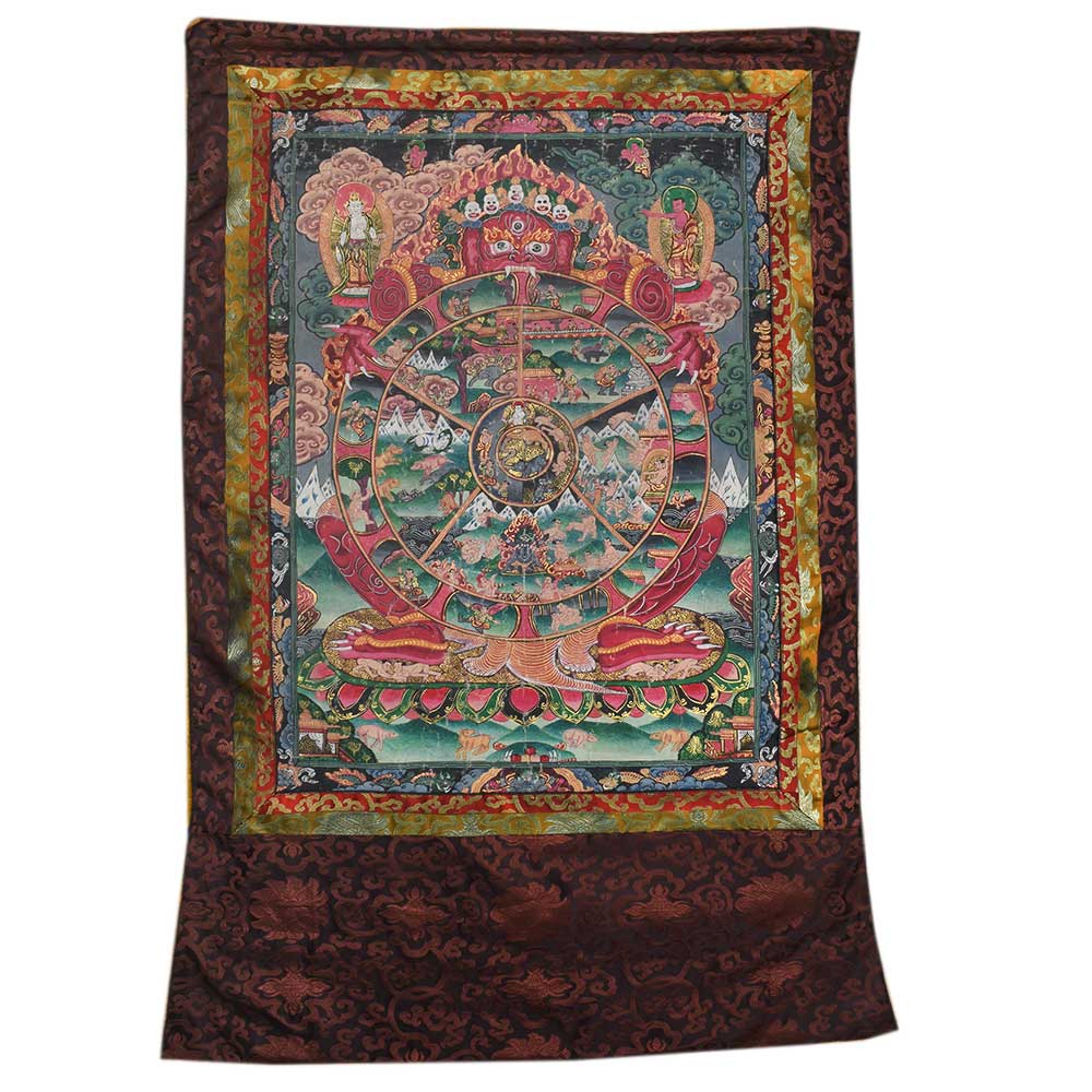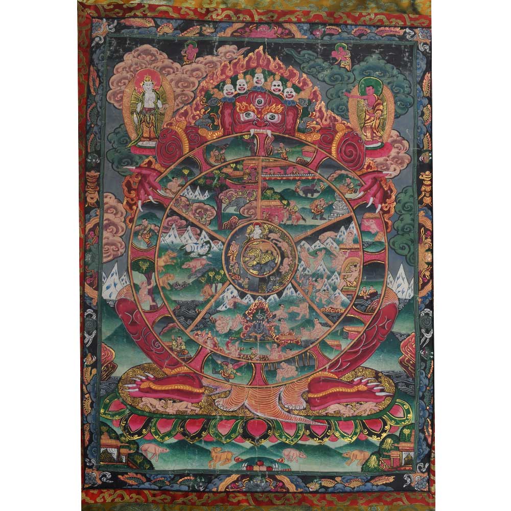 The traditional portrayal of the samsaric cycle of existence in red and brown tones is known as the Wheel of Life or Riduk. It's a complicated symbolic portrayal of samsara in the shape of a circle that's mostly found in Tibetan Buddhist art. Yama the god of death or Kala the master of time are two popular choices for the figure.