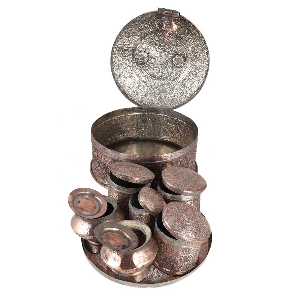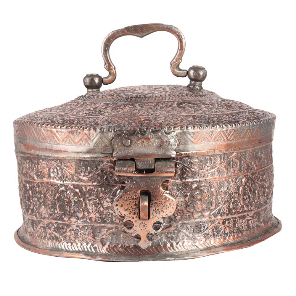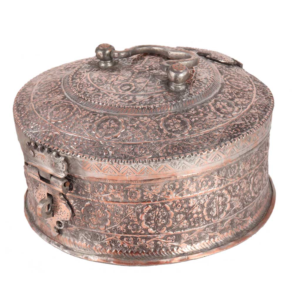 Indian tinned copper pandan box from the eighteenth century. Pandan is a name in both Urdu and Hindi. A pandan is a plant that is used to store betel leaf, betel nut, powdered tobacco, lime, catchu, and kesar. It has a hinged lid. Hand-tooled design of flowers and vines. Beautiful deep, rich patina best for gifting.
