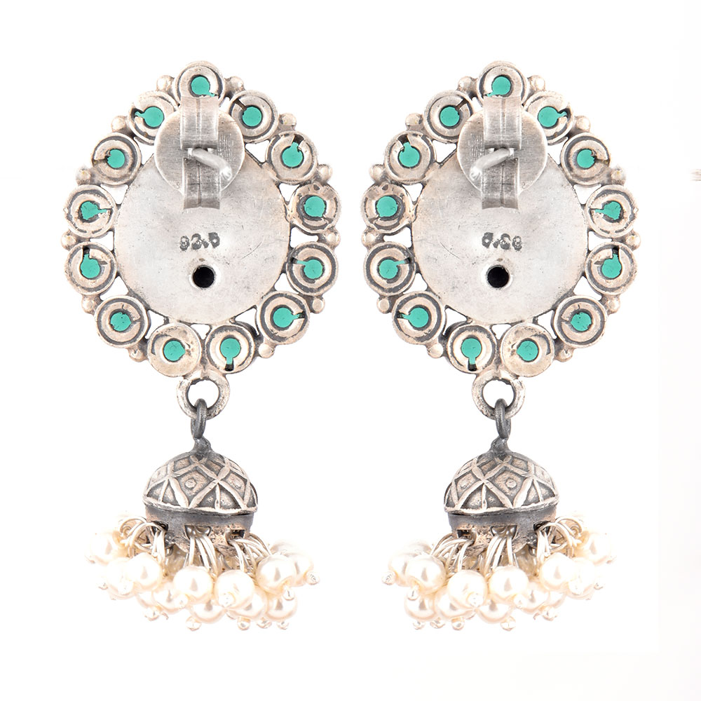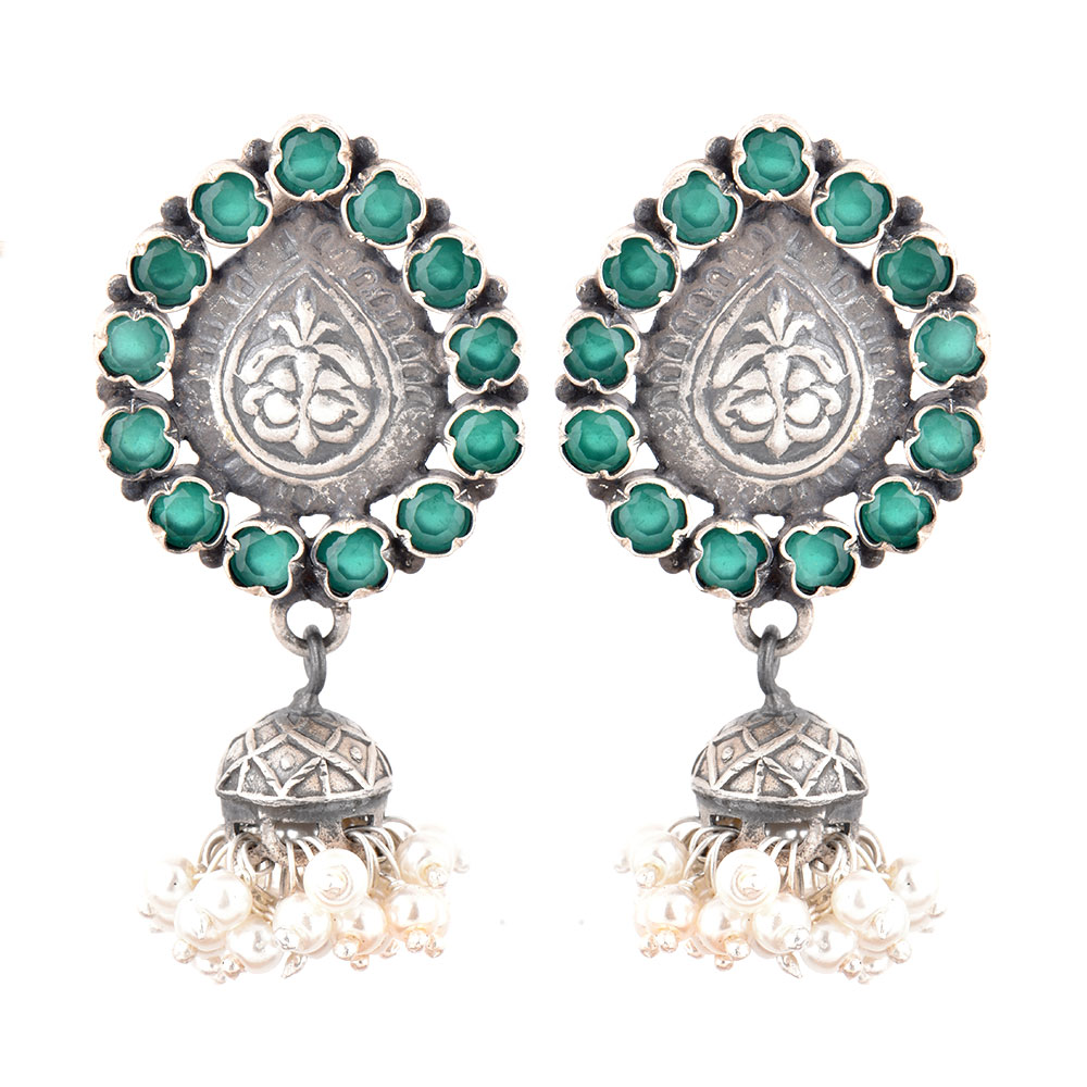 Fancy Designer Green Onyx Stone Oxidized Jhumki Earrings 92.5 sterling silver dangle and drop earrings for women that looks stunning and is preciously suitable for all kinds of dressy occasions. Perfectly suited for Wedding, Ethnic, Festive Party wear.