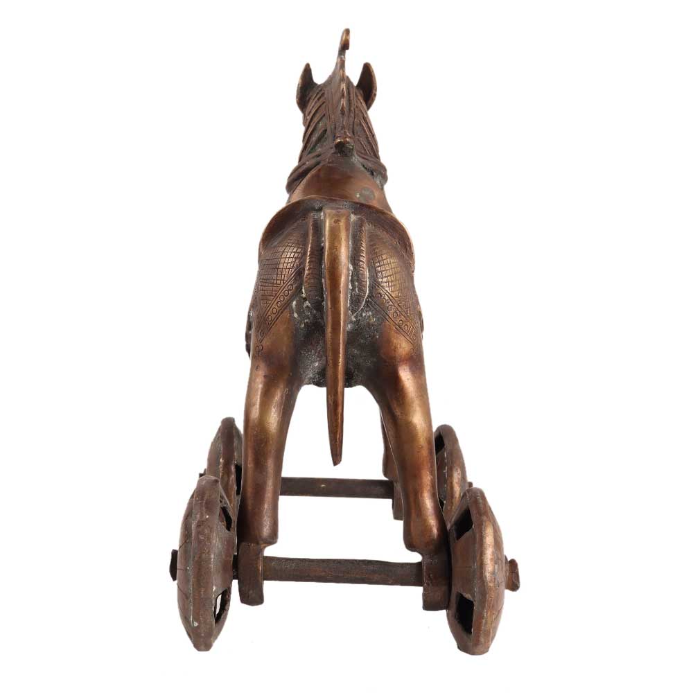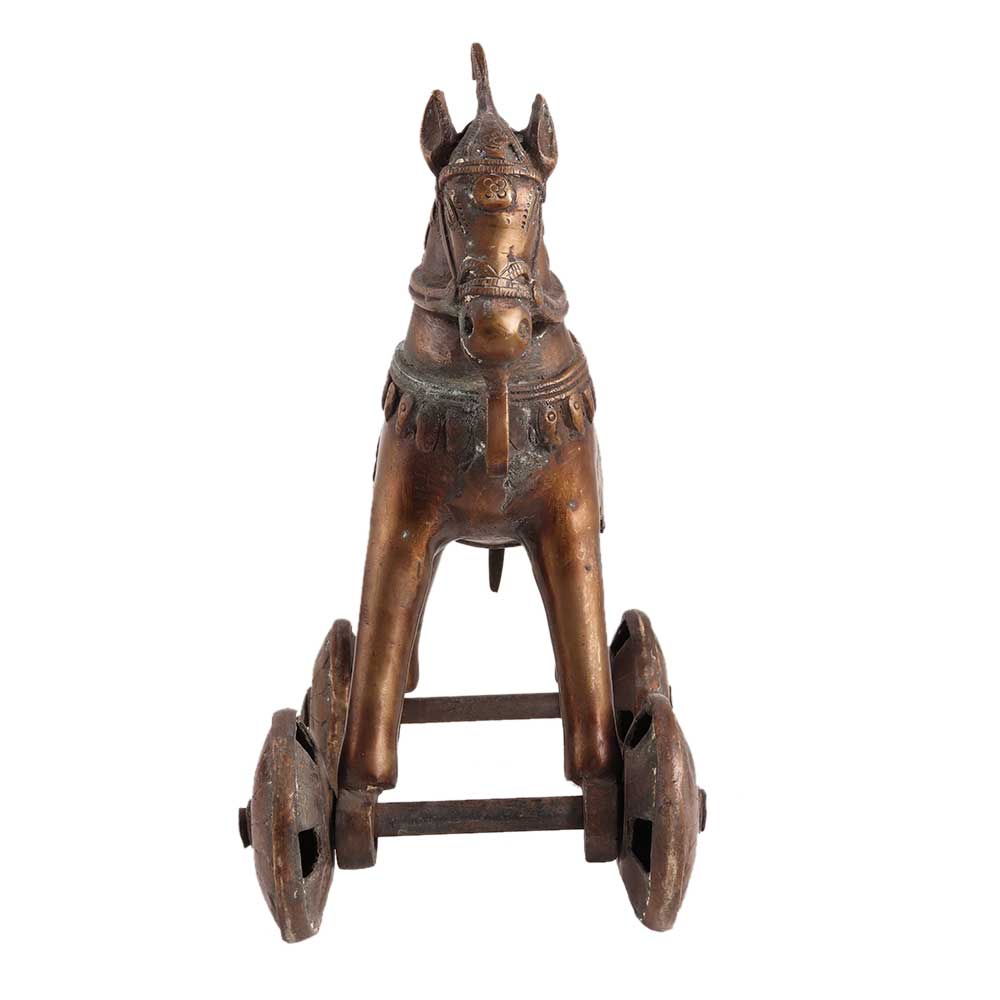 Handcrafted brass Toy horse statue from a Southern Indian Hindu Temple. This temple toy is a superb and rare collectible Southern Indian brass heavy temple toy horse, supported on 4 wheels, furnished with fine bridle, the horse and wheels are in good antique condition, the horse moves smoothly on wheel