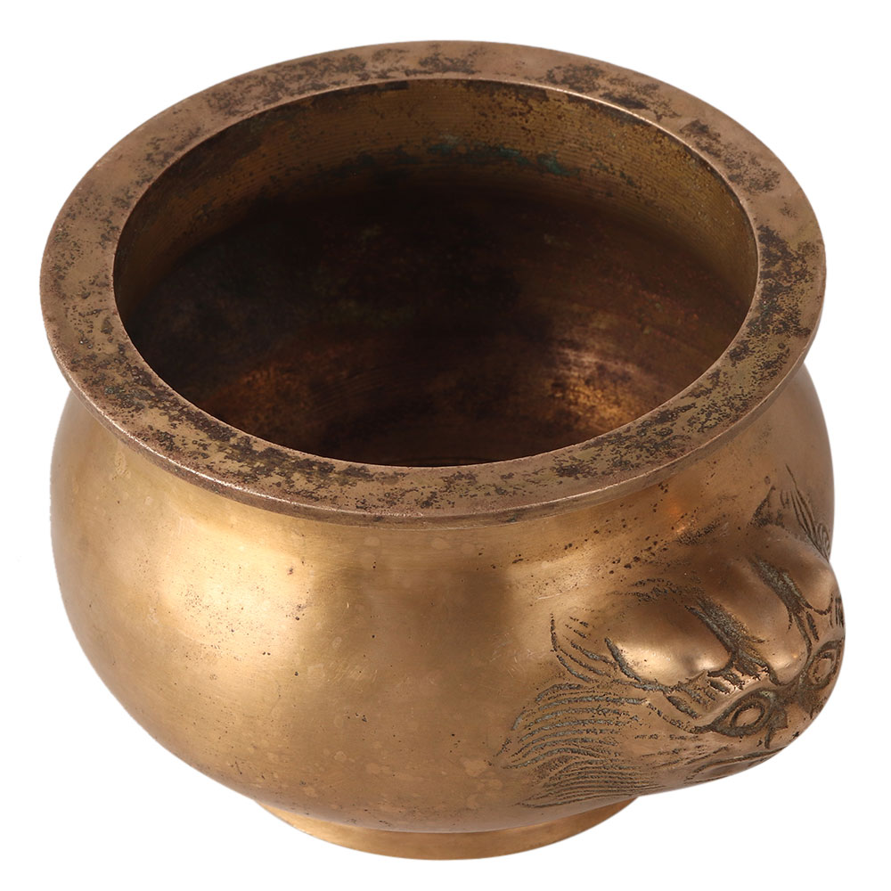 This brass Lota or water pot is traditionally made by skilled craftsmen with their hands. It features two embossed lion faces opposite to each other. The lion face is engraved in Chinese art. It has a stand at the bottom to stay on the surface. The water pots or Lota are used in Hindu rituals to hold sacred water, rice or gold coins. A decorative piece for your home, cafe, bar or hotel. Place them on tables and shelves in your restaurant or hotel to enhance the interior design.