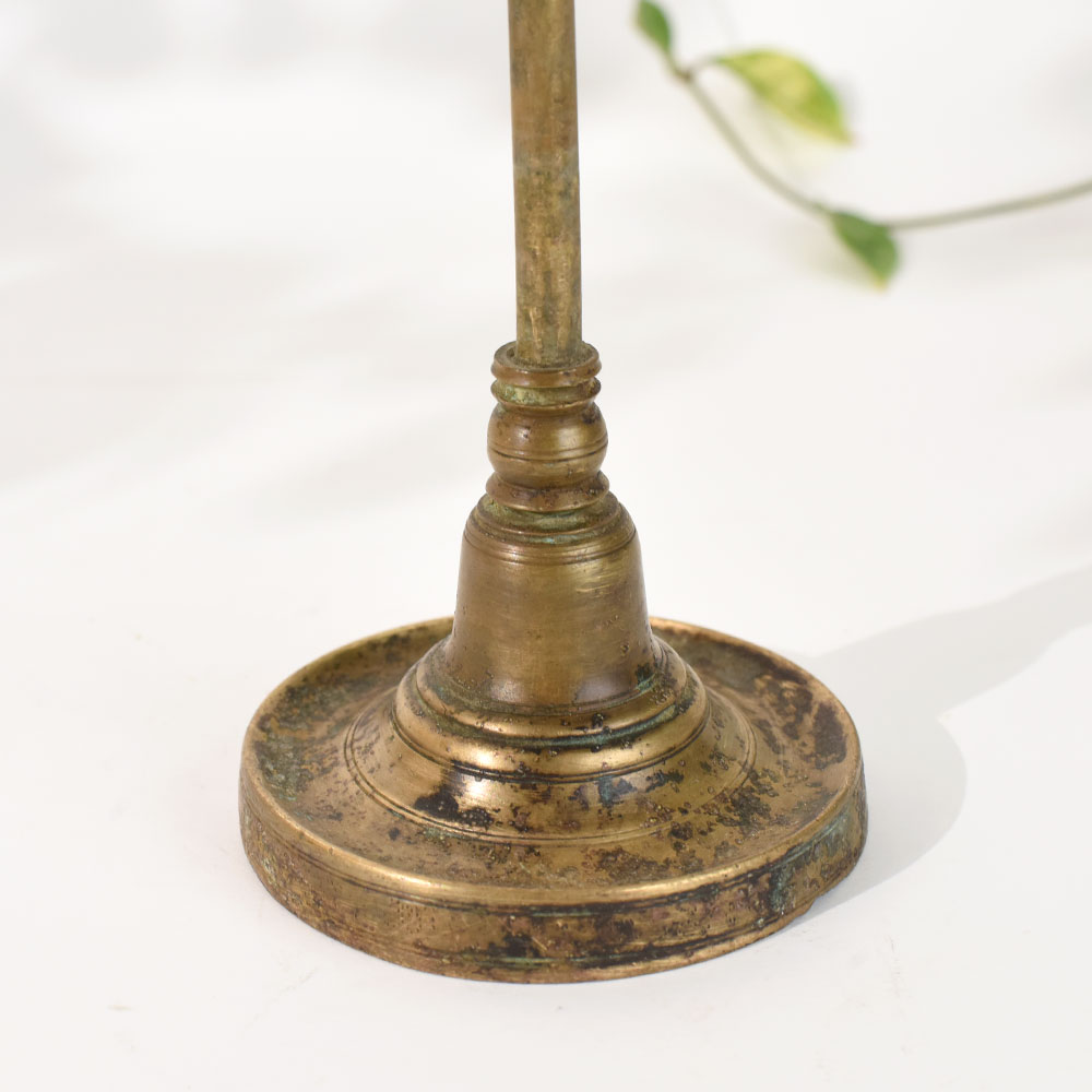 Bring home the warmth, heritage, and spiritual charm of South India with this handcrafted vintage brass oil lamp stand with adjustable height. Designed with traditional motifs and a finely sculpted top finial, this classic lamp stand adds a sacred glow to prayer rooms, festive decor, and heritage-inspired interiors. The rich brass patina enhances its antique appeal, making it an elegant collectible for lovers of South Indian art. The lamp features an adjustable height mechanism, allowing you to raise or lower the diya plate as needed, making it both functional and decorative. Whether used for daily rituals or displayed as a statement accent piece, this oil lamp stand elevates the ambience with its cultural authenticity.