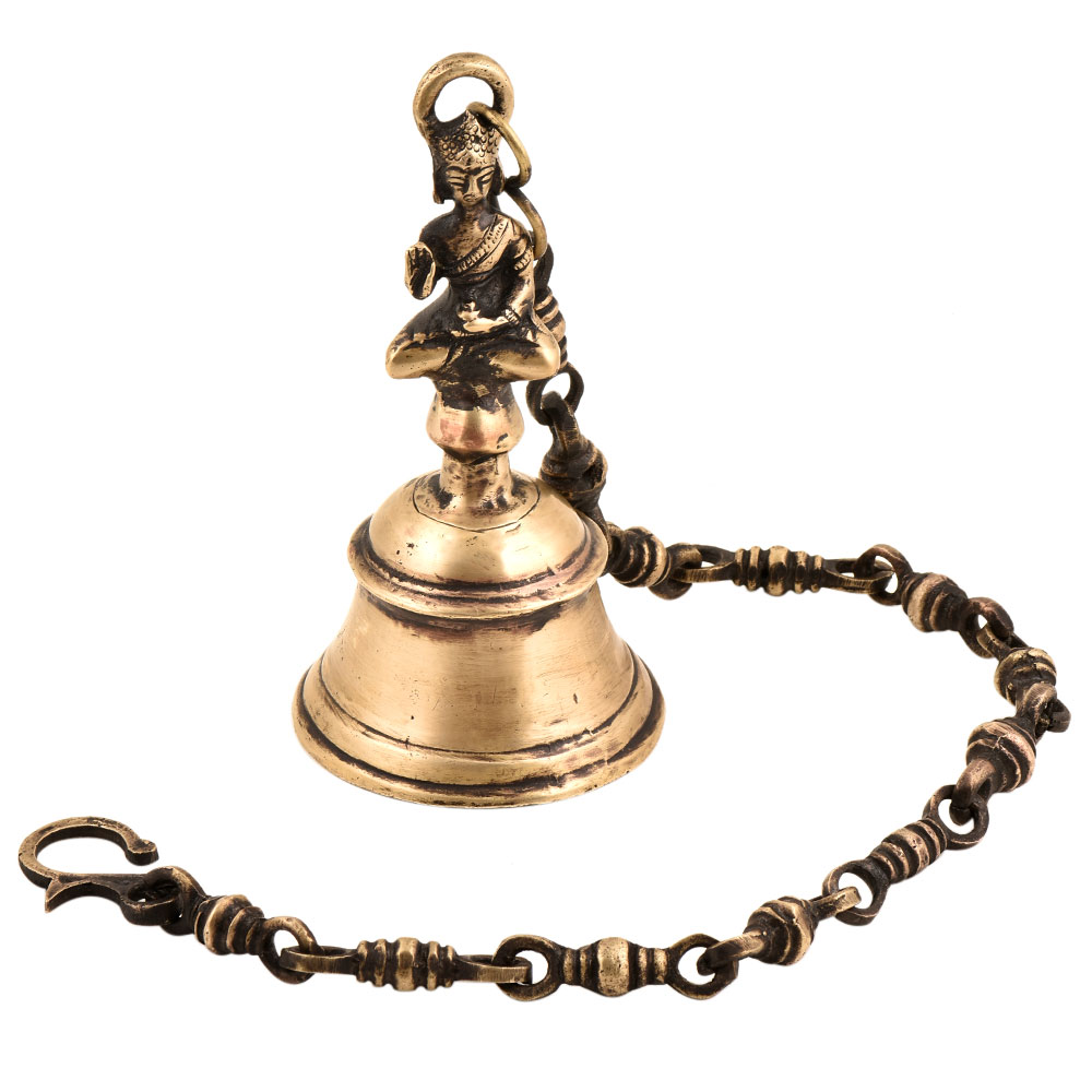 The beautiful handcrafted solid brass temple bell has a small brass Lord Buddha statue on top of the bell. A solid brass chain is attached to the bell with a big hook useful for hanging in homes or temples. The bell produces a pleasant and rich tonal sound which creates a peaceful ambience which is considered very auspicious .The bell is excellent for personal use or for gifting purpose.