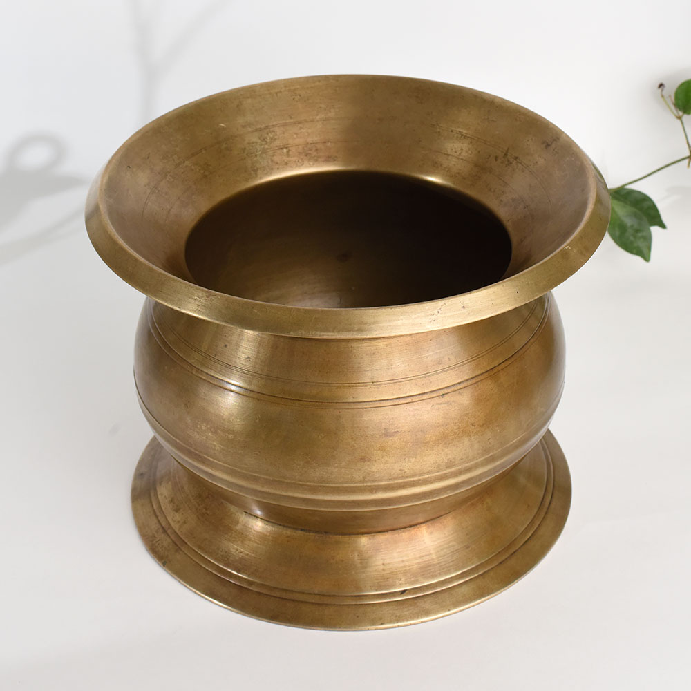 Channel the essence of heritage with this traditional brass water pot. Its distinctive shape, featuring a wide rim and rounded body, recalls vessels used in Indian households for storing water or ceremonial purposes. Crafted by hand from heavy brass, it stands strong and stable, making it suitable for both practical and decorative use. Fill it with fresh flowers, tall branches, or sacred water during rituals, and place it in a living room or porch to enjoy its sculptural form. The golden hue adds warmth to any setting, while the pot’s graceful curves lend elegance. Each piece showcases slight differences in texture and finish, offering a one of a kind example of artisanal craftsmanship.