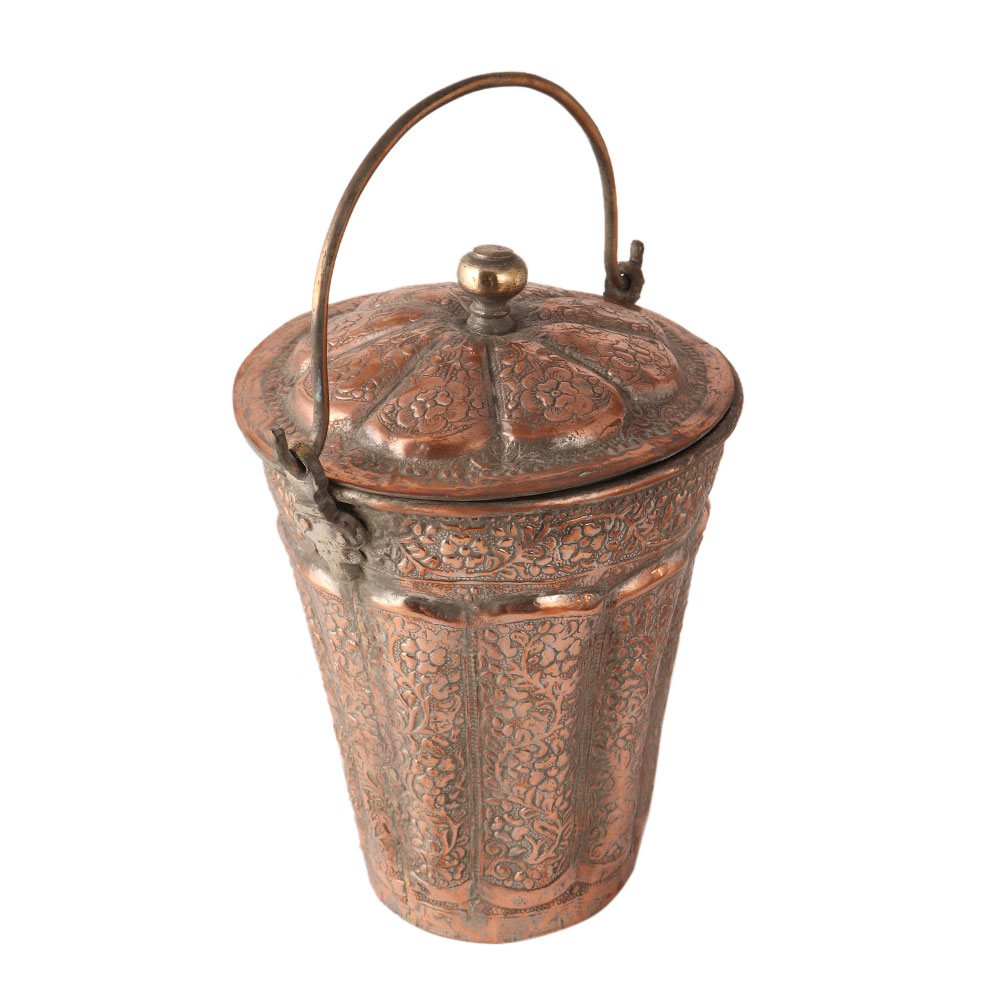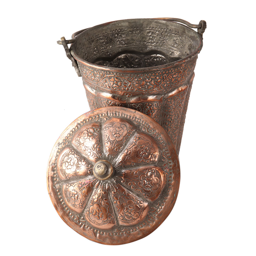 Traditional copper bucket with a lid and a handle. It was carved with Islamic art. It was engraved with a flower tendril pattern. It can be displayed in your collection.