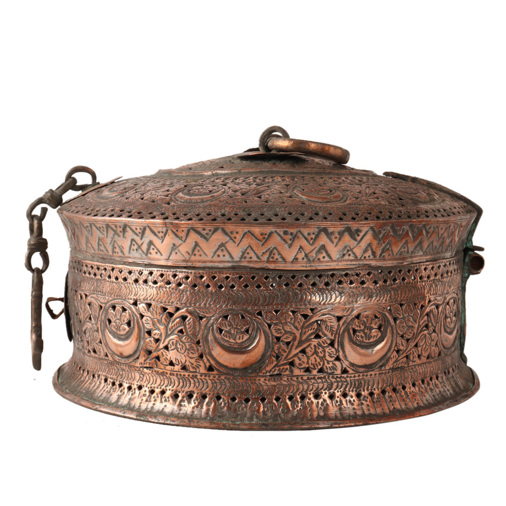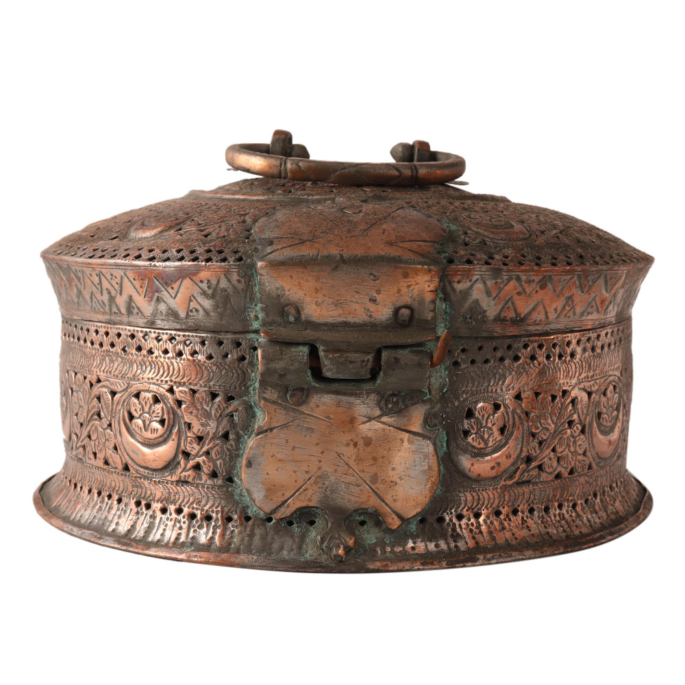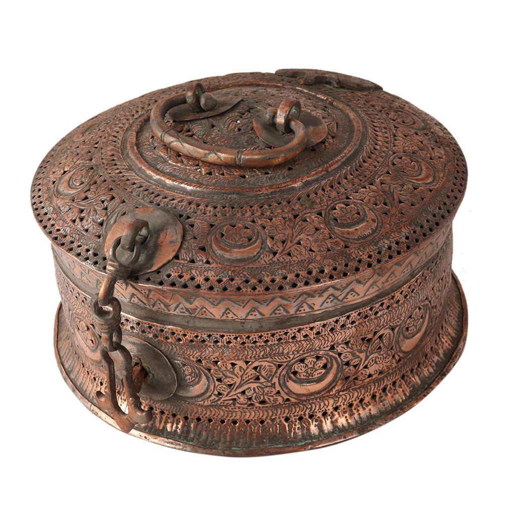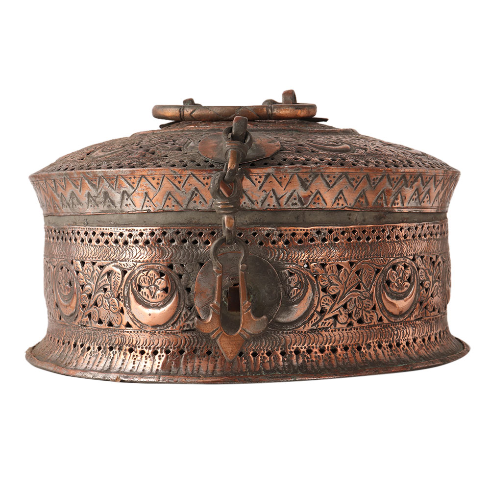 The traditional jewelry box was used to store jewelry and other valuable items. It is made of copper and has a handle on the top to hold it. It has a beautiful jali work with floral patterns on it. Use it to display or store your jewelry in the box.