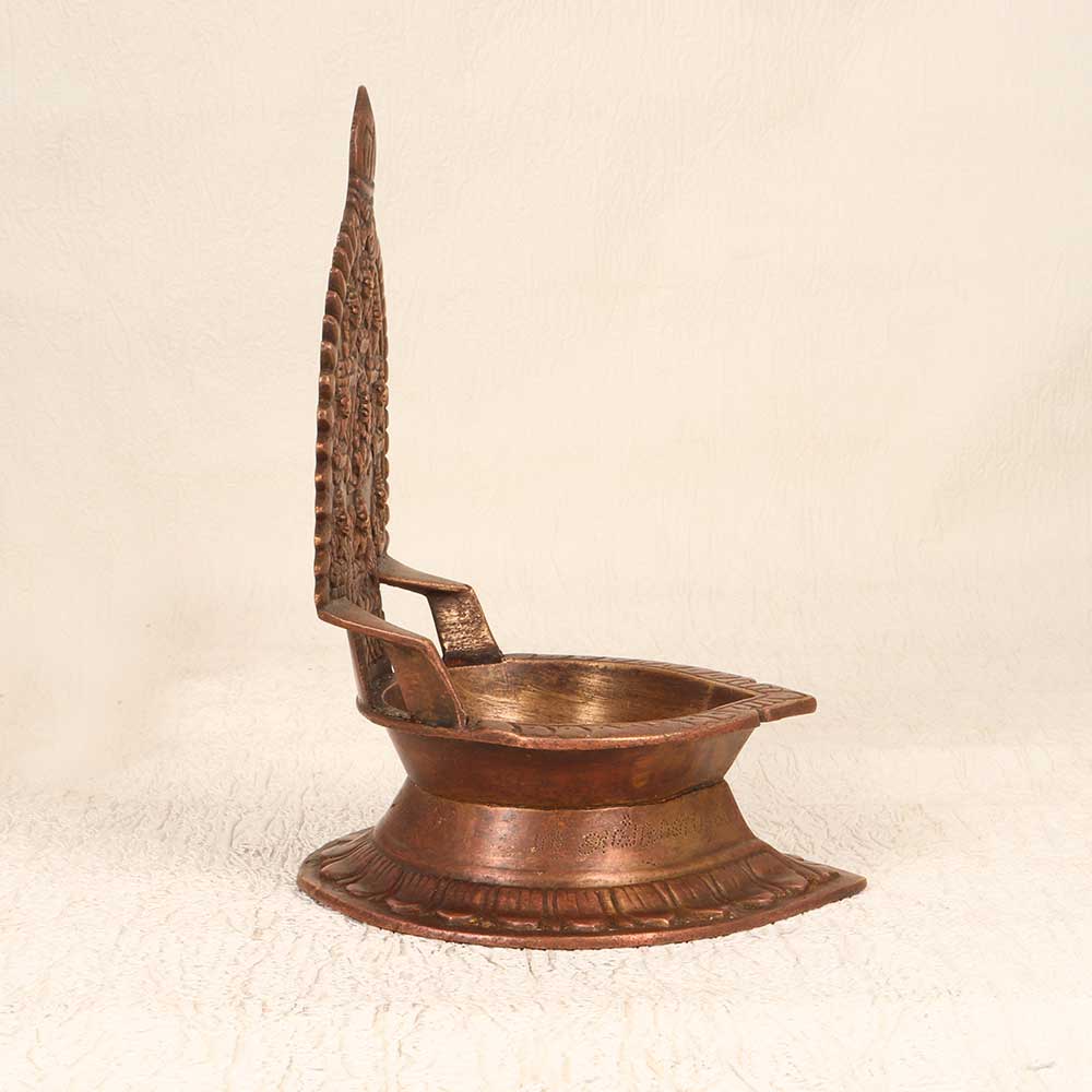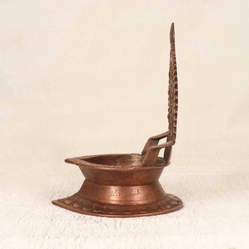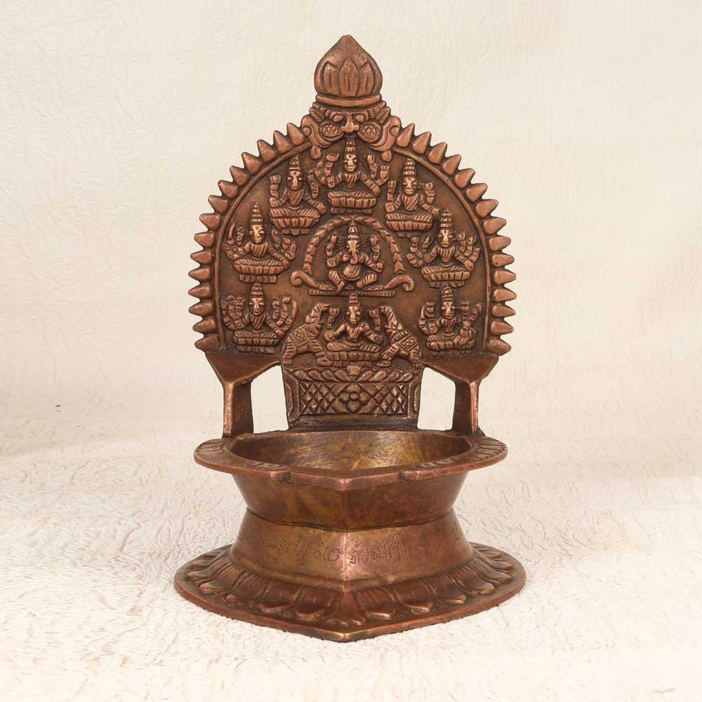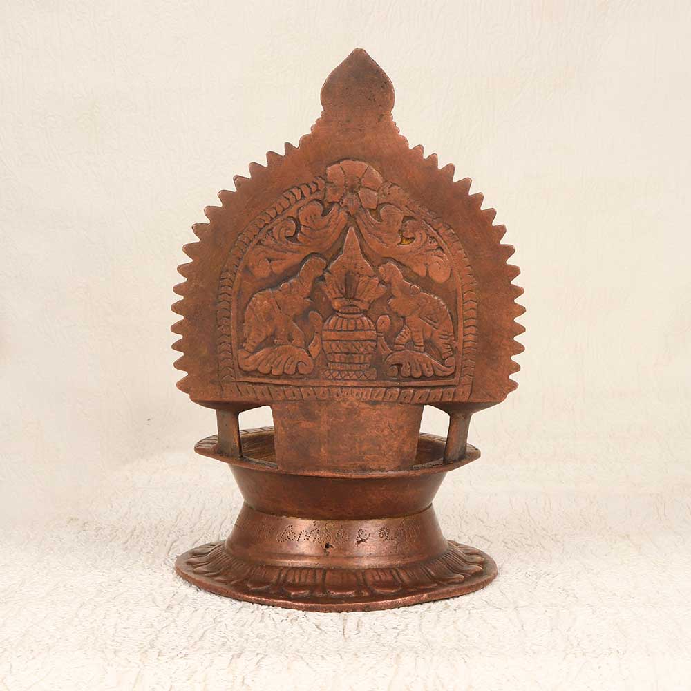 Feel the calming glow of yesteryear with this vintage brass Gajlaxmi Oil Lamp, an authentic relic of South Indian artisanship. Meticulously handcrafted, this lamp features the abundant goddess Gajlaxmi rising from a lotus, surrounded by ornate vines and flowers. Its antiqued patina and elegant form exude old-world charm. Create a peaceful ambiance and invoke the blessings of Gajlaxmi with the light of this special lamp. Its timeless beauty and craftsmanship make a meaningful addition to puja altars, bedrooms, living rooms, and more. A handsome home accent that connects you to history.
